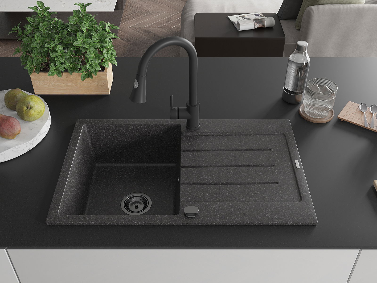 Mexen Bruno žulový kuchynský drez 1-komorový s odkvapkávačom a kuchynskou batériou Elia, čierny fľakatý - 6513-76-670101-70-B