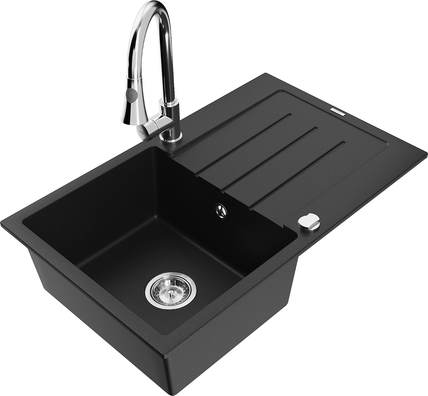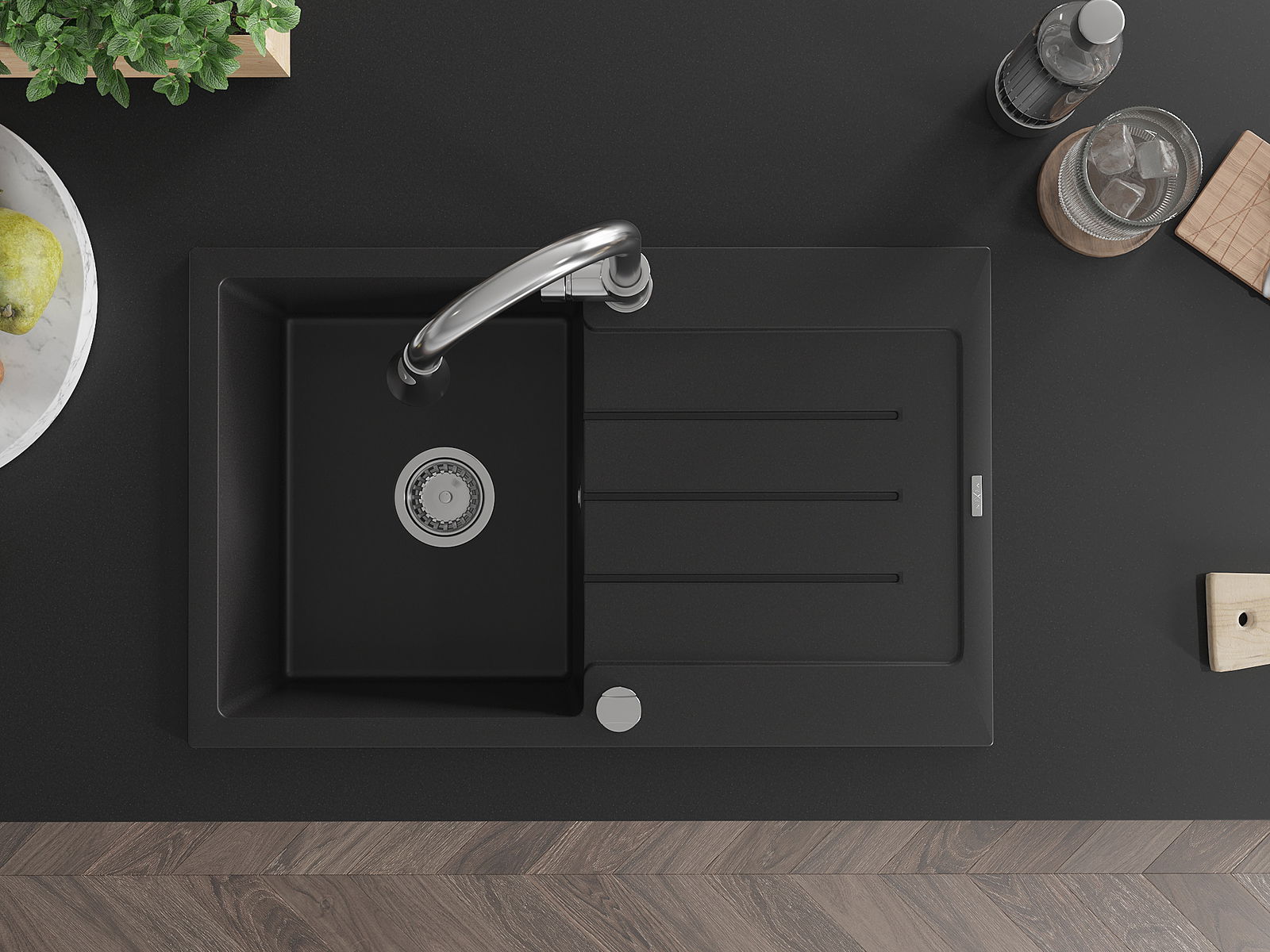 Mexen Bruno žulový kuchynský drez s 1 komorou, odkvapkávacia časť a kuchynská batéria Elia, čierny - 6513-77-670101-00