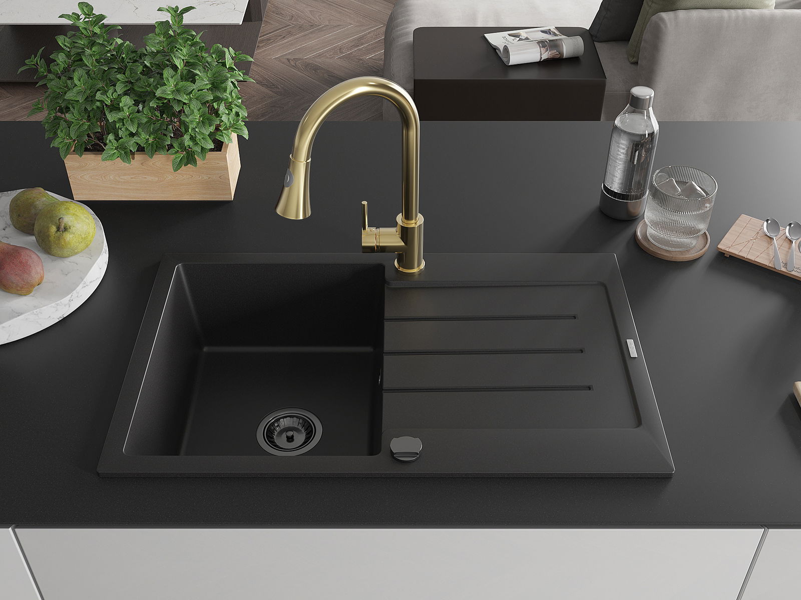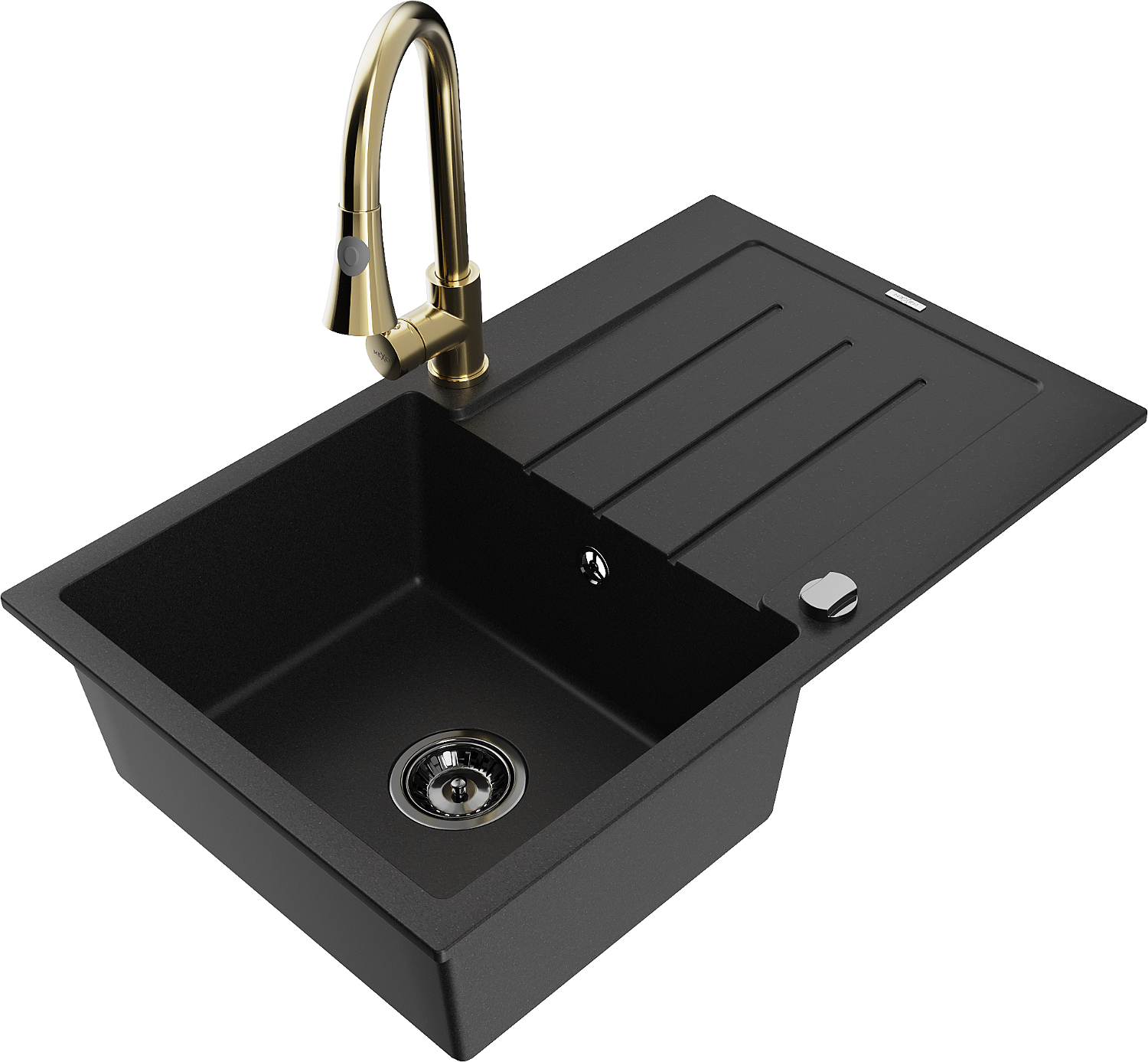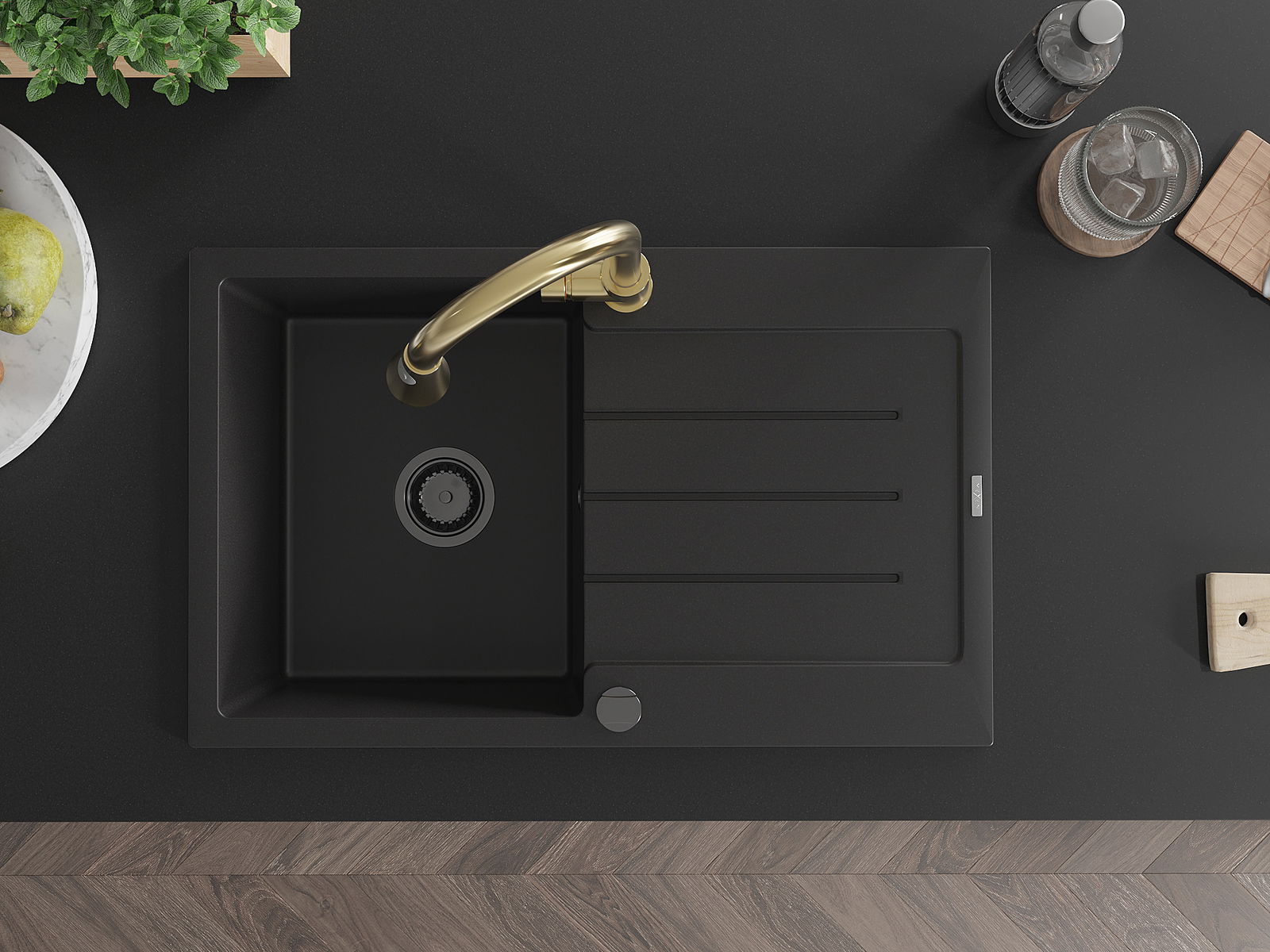 Mexen Bruno žulový drez 1-komorový s odkvapkávačom a kuchynskou batériou Elia, čierny - 6513-77-670101-50-B