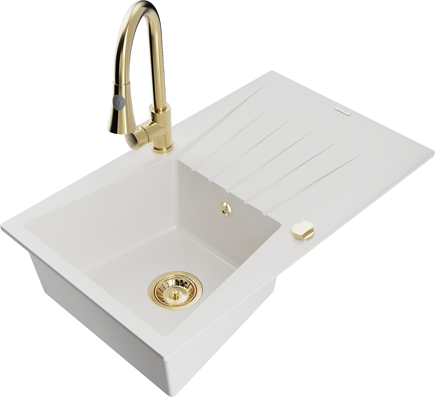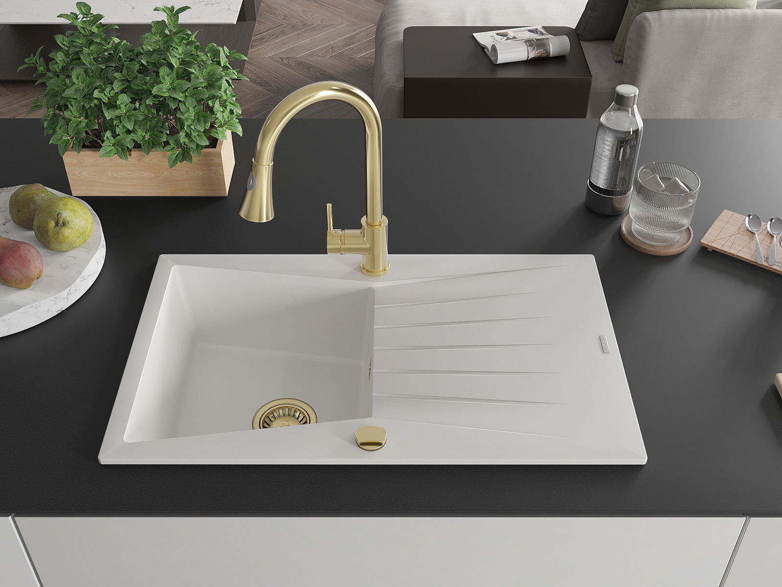 Mexen Cesar žulový drez 1-komorový s odkvapkávačom a kuchynskou batériou Elia, biely - 6514-20-670101-50