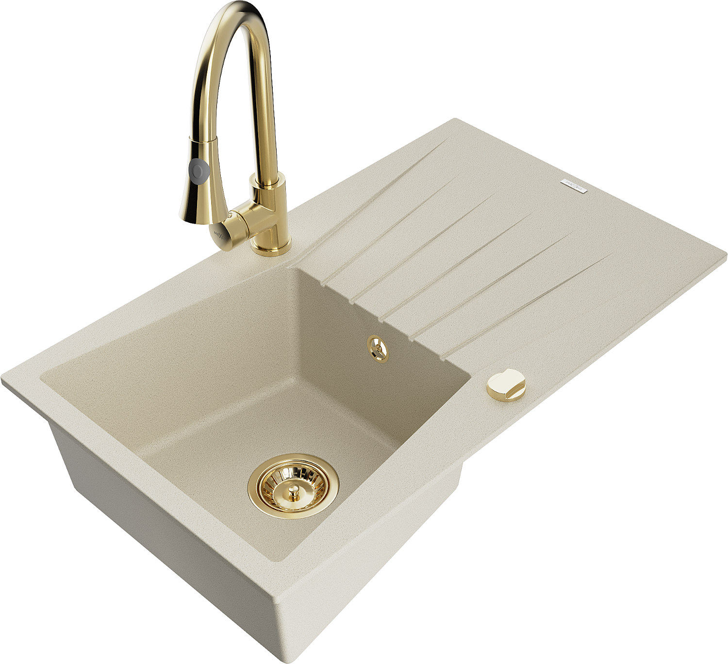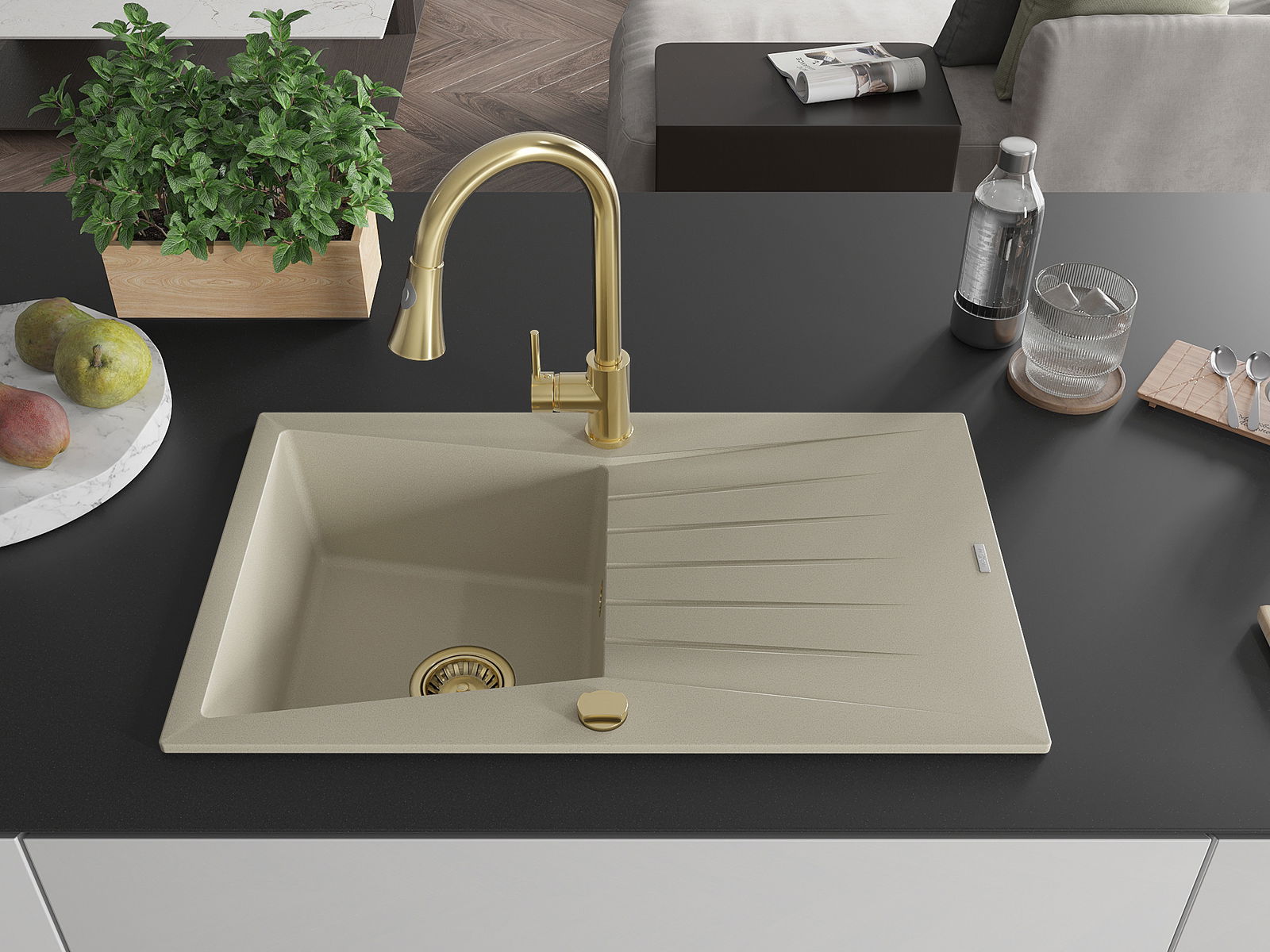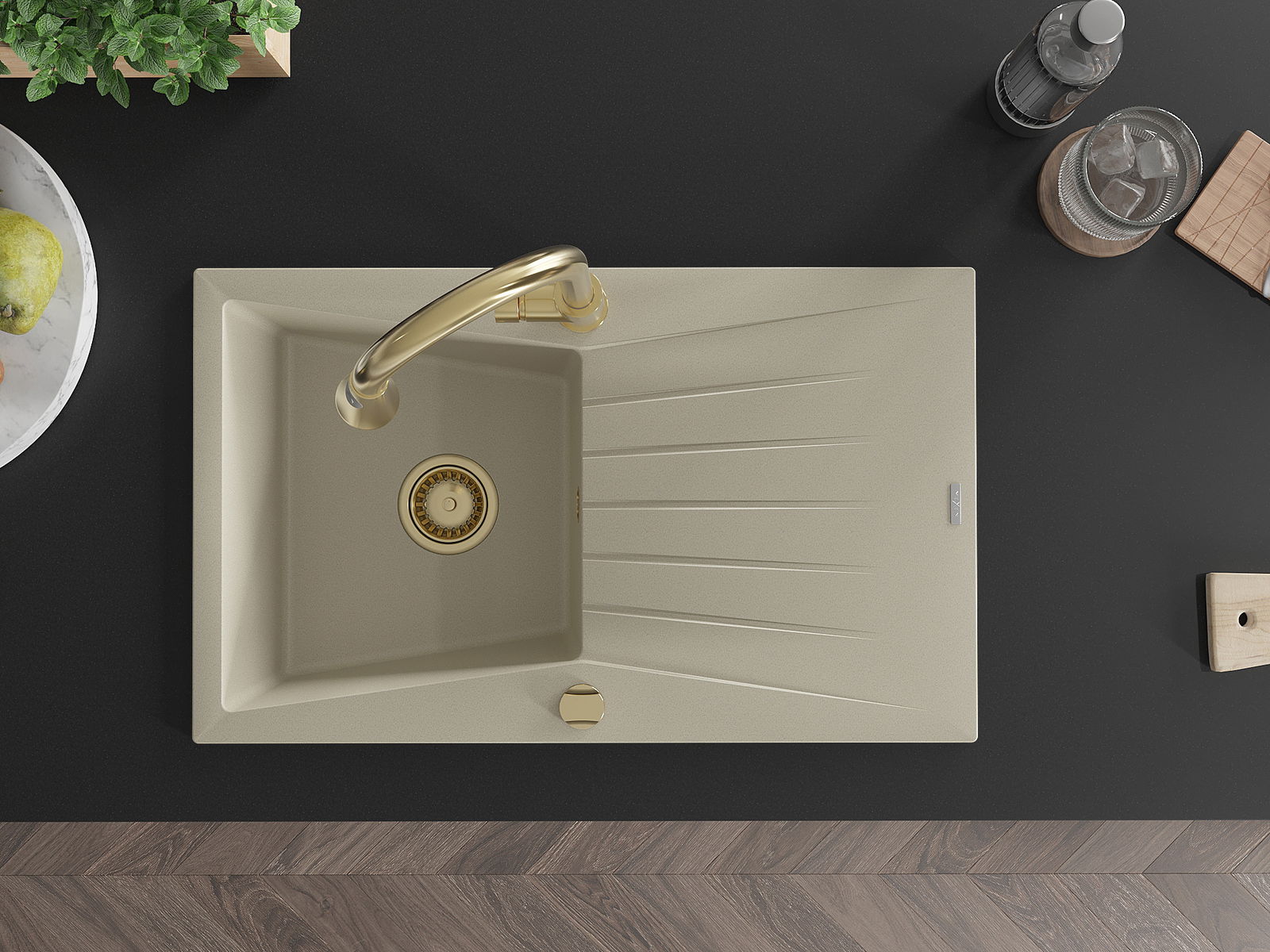 Mexen Cesar žulový drez, 1-komorový s odkvapkávačom a kuchynskou batériou Elia, béžový - 6514-69-670101-50