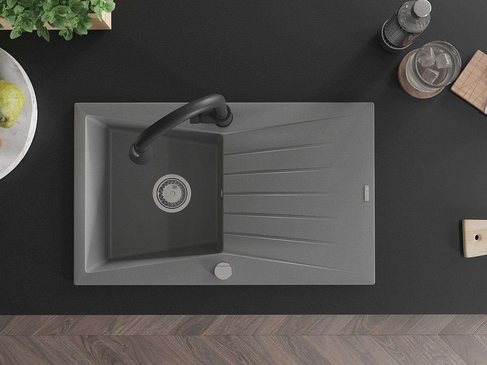 Mexen Cesar jednokomorový žulový drez s odkvapkávacou plochou a kuchynskou batériou Elia, sivý - 6514-71-670101-70