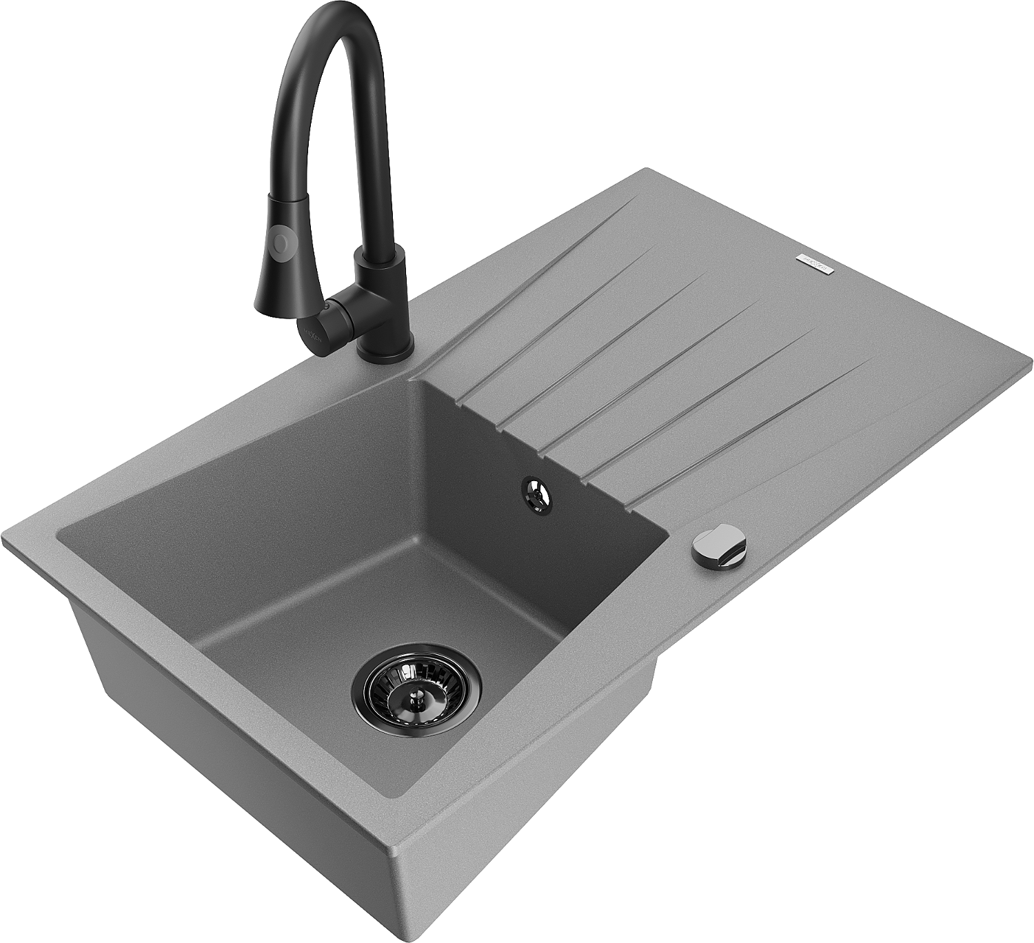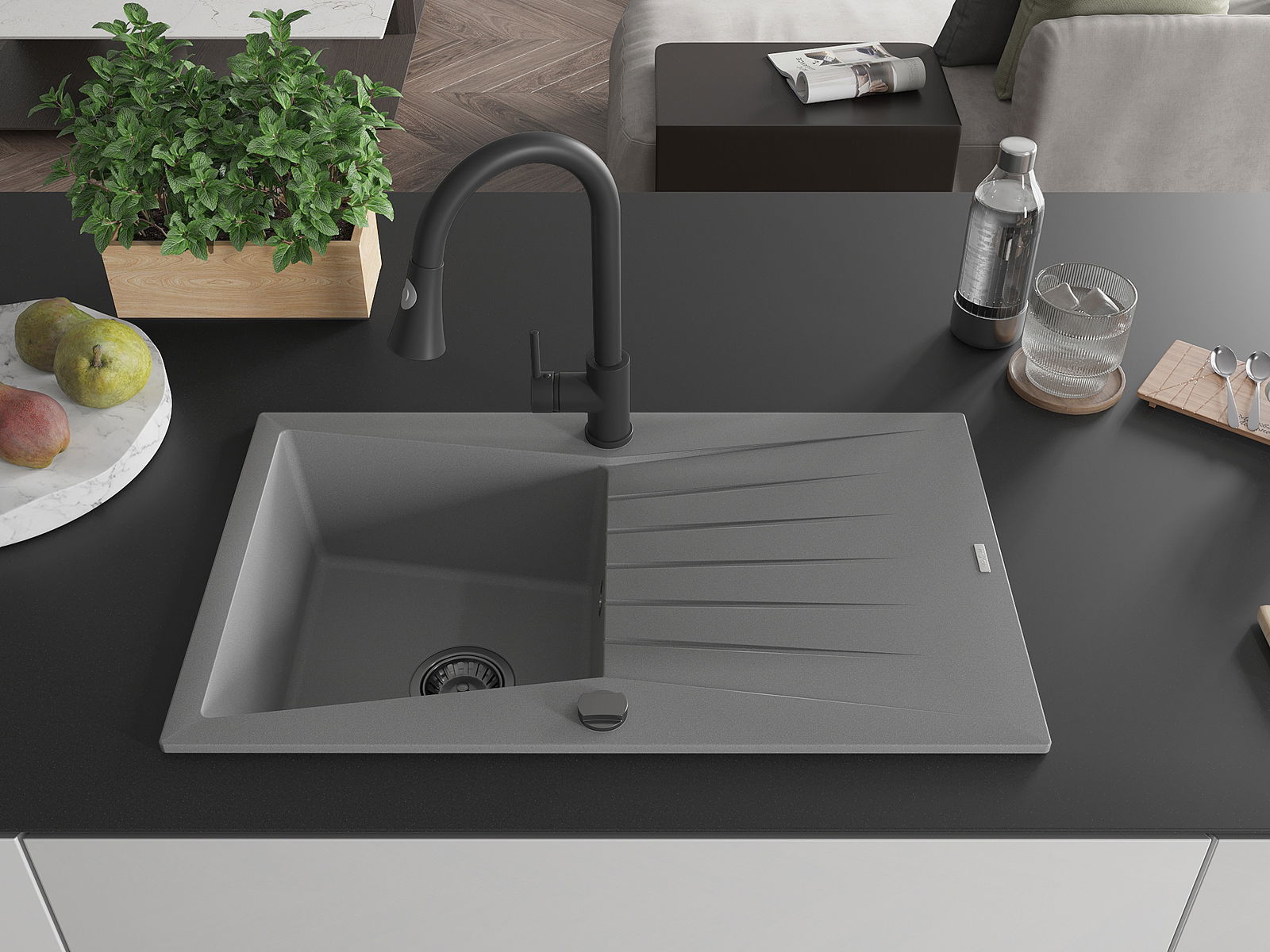 Mexen Cesar Granitový drez 1-komorový s odkvapkávačom a kuchynskou batériou Elia, šedá - 6514-71-670101-70-B