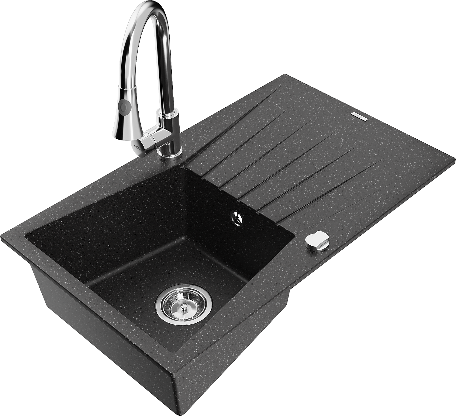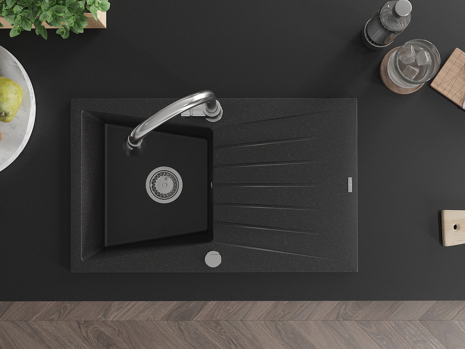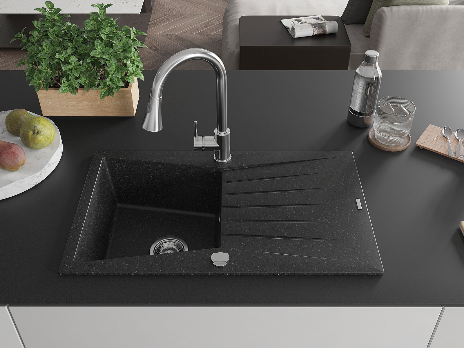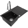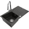 Mexen Cesar granitový drez s 1 komorou s odkvapkávačom a kuchynskou batériou Elia, čierny/strieborný metalik