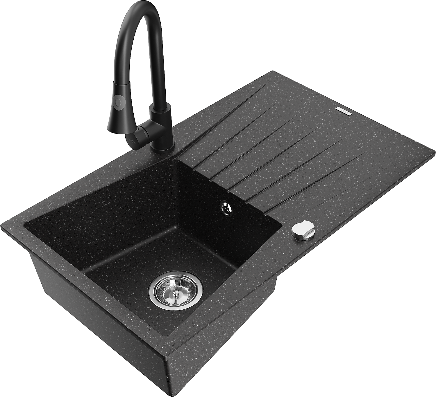 Mexen Cesar granitový drez s 1 komorou a odkvapom a kuchynskou batériou Elia, čierny/strieborný metalický - 6514-73-670101-70