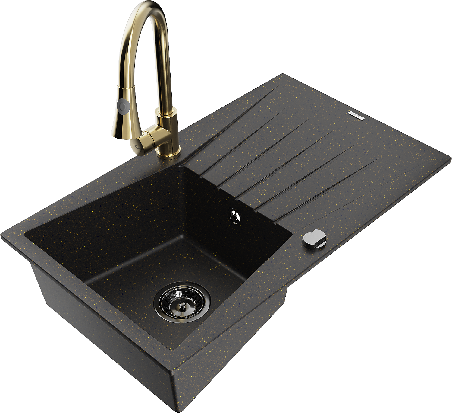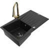 Mexen Cesar jednokomorový žulový drez s odkvapkávačom a kuchynskou batériou Elia, čierna/zlatá metalíza - 6514-75-670101-50-B