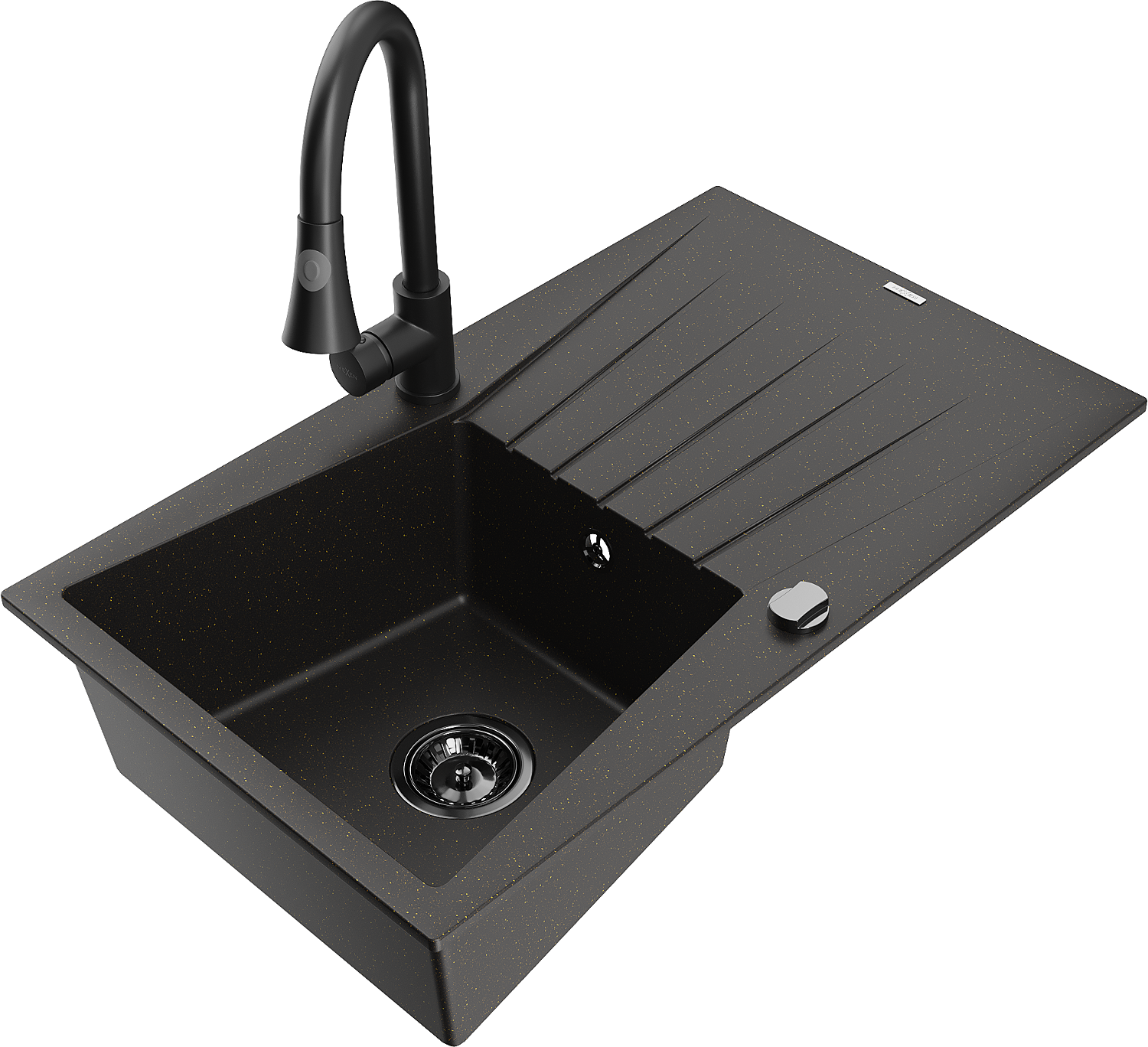 Mexen Cesar granitový kuchynský drez s 1-komorou s odkvapkávačom a kuchynskou batériou Elia, čierny/zlatý metalický