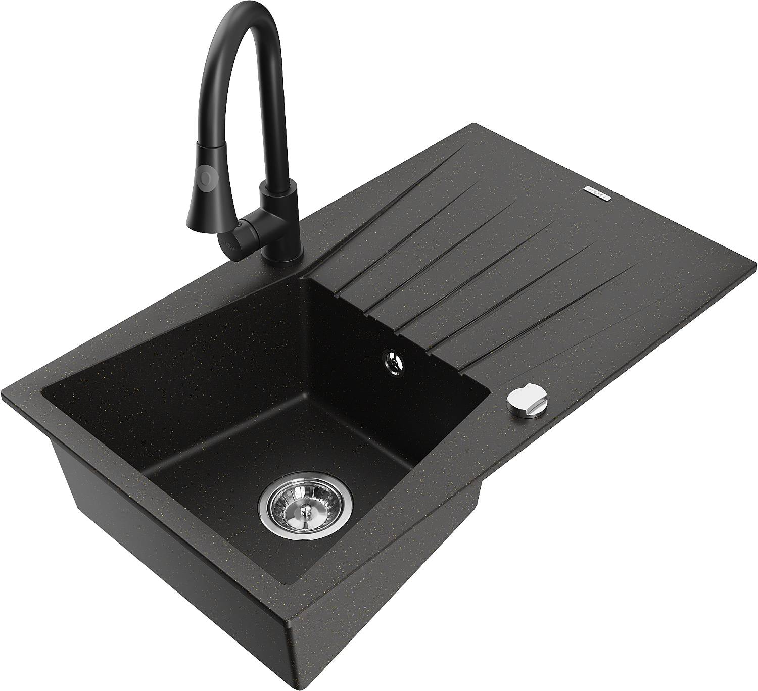 Mexen Cesar granitový jednopriestorový drez s odkvapkávačom a kuchynskou batériou Elia, čierny/zlatý metalický