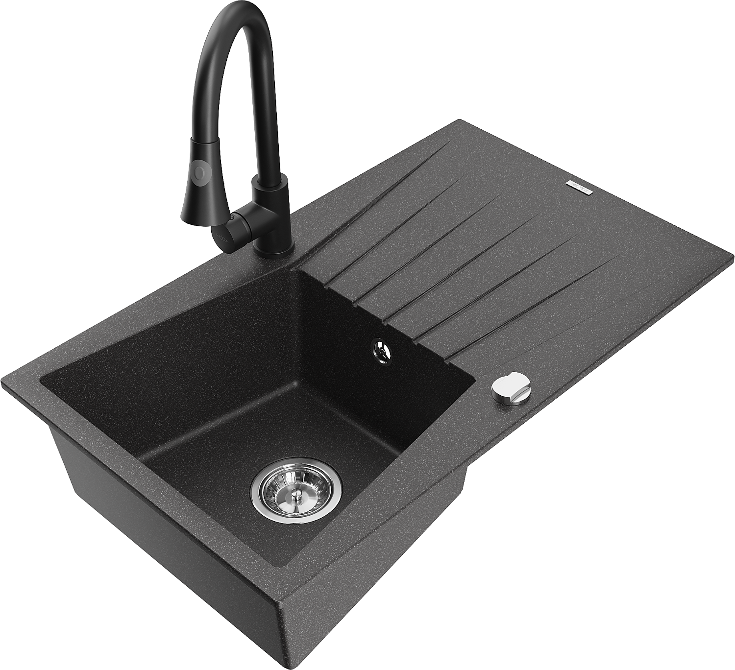 Mexen Cesar granitový drez s 1 komorou s odkvapkávacou plochou a kuchynskou batériou Elia, čierny škvrnitý