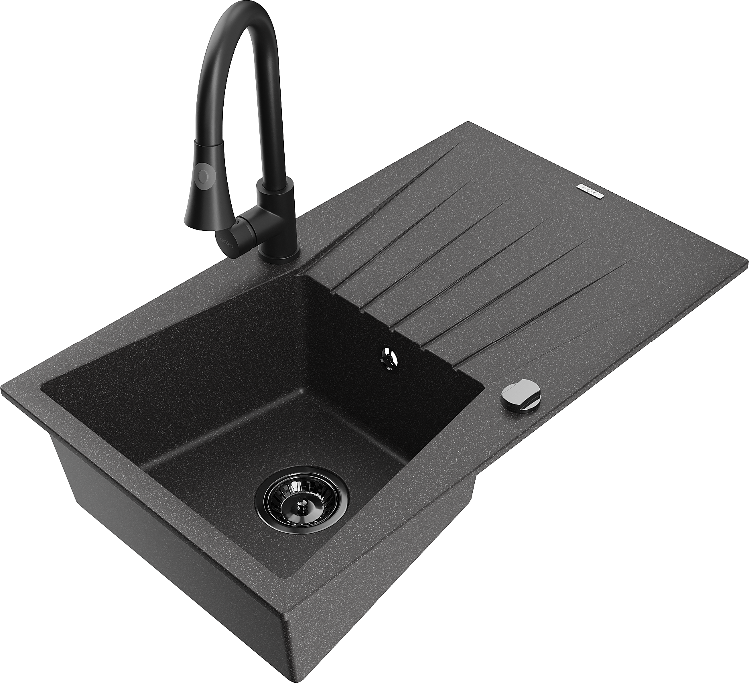 Mexen Cesar žulový drez 1-komorový s odkvapkávačom a kuchynskou batériou Elia, čierny fľakatý - 6514-76-670101-70-B