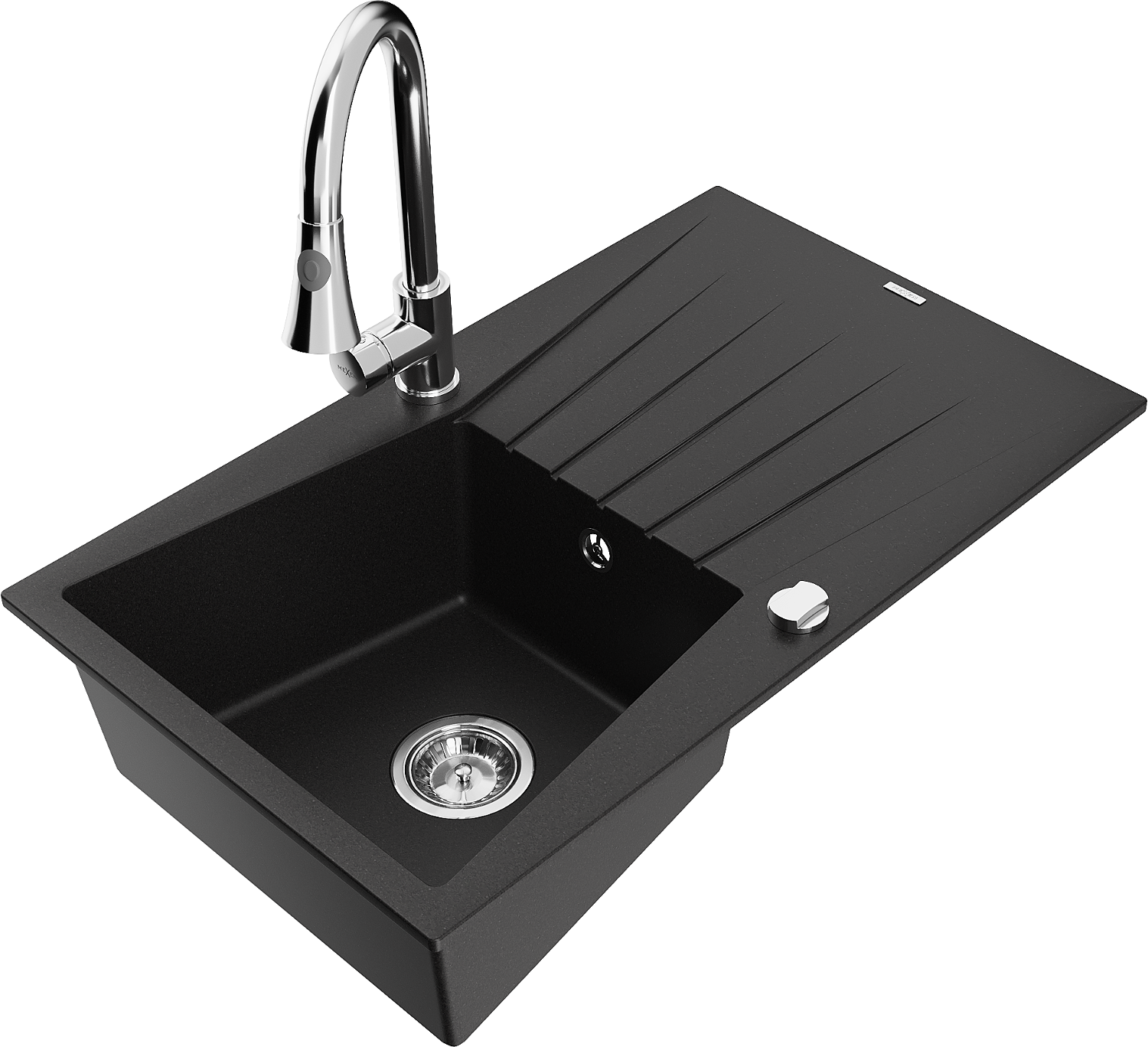 Mexen Cesar granitový kuchynský drez 1-komorový s odkvapkávačom a kuchynskou batériou Elia, čierny - 6514-77-670101-00
