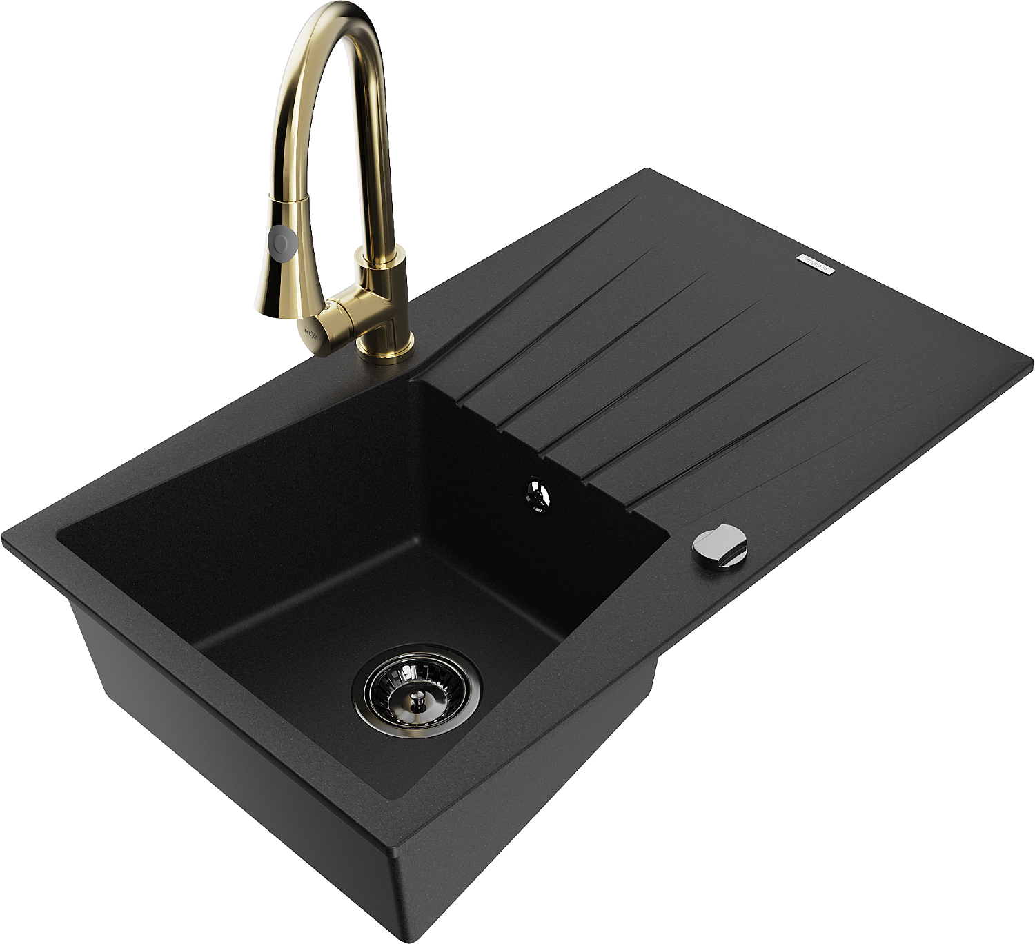 Mexen Cesar žulový kuchynský drez, 1-komorový s odkvapkávačom a kuchynskou batériou Elia, čierny - 6514-77-670101-50-B