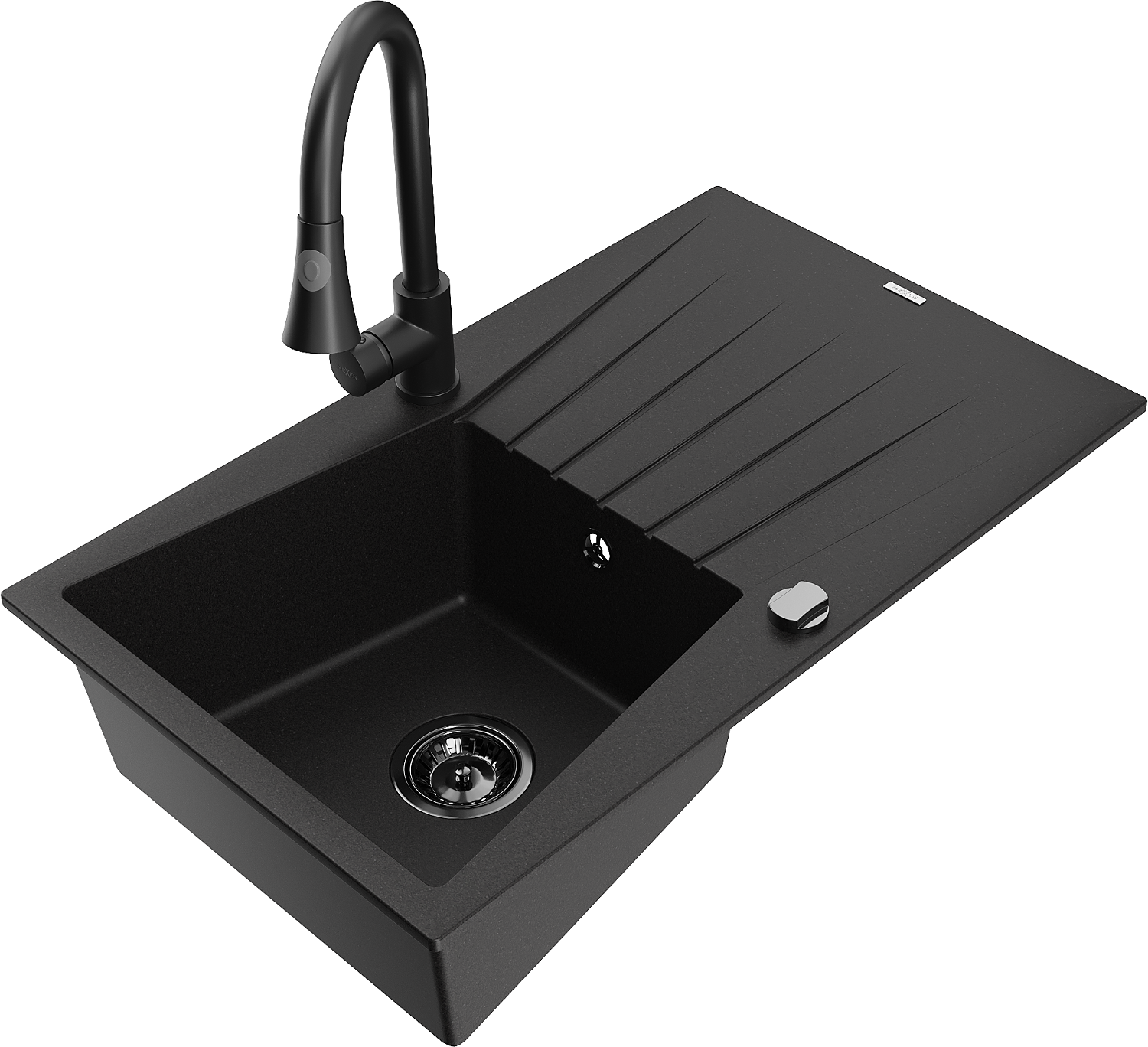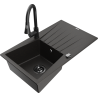 Mexen Cesar žulový drez s 1 komorou a odkvapkávacou plochou s kuchynskou batériou Elia, čierna - 6514-77-670101-70-B