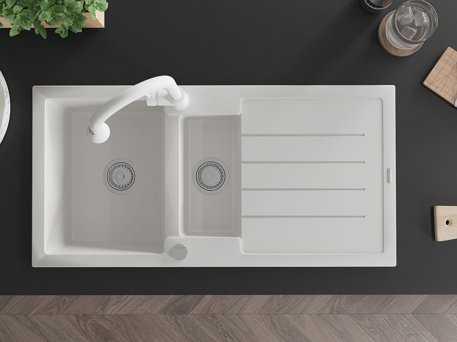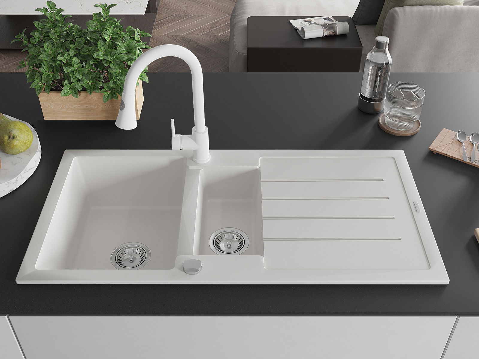 Mexen Andres granitový kuchynský drez 1,5-komorový s odkvapkávačom a kuchynskou batériou Elia, biela - 6515-20-670101-20