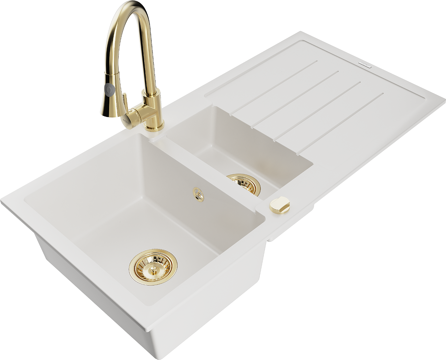 Mexen Andres žulový drez 1,5-komorový s odkvapkávačom a kuchynskou batériou Elia, biely - 6515-20-670101-50