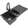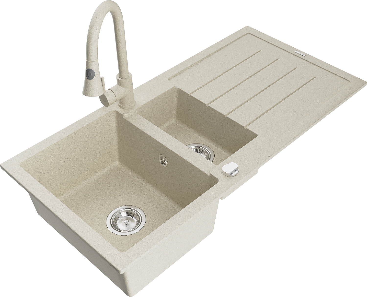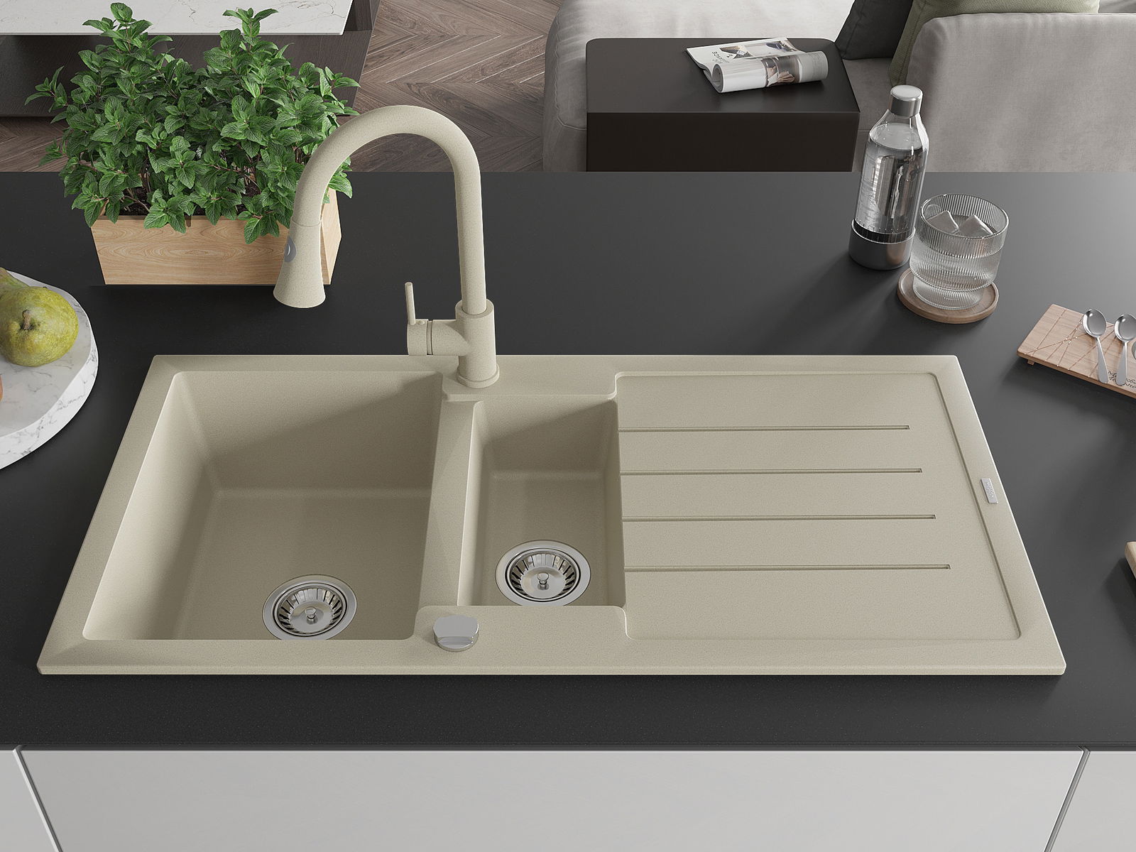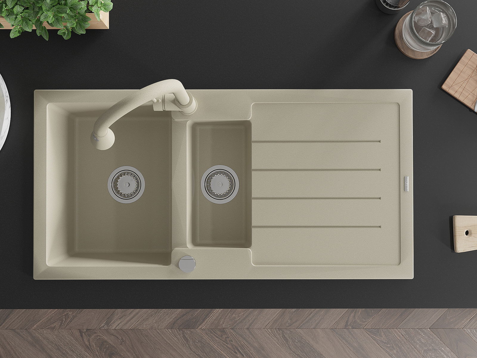 Mexen Andres granitový drez 1,5-komorový s odkvapkávacou plochou a kuchynskou batériou Elia, béžový - 6515-69-670101-69
