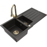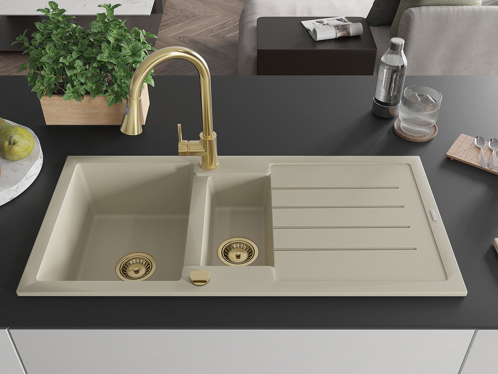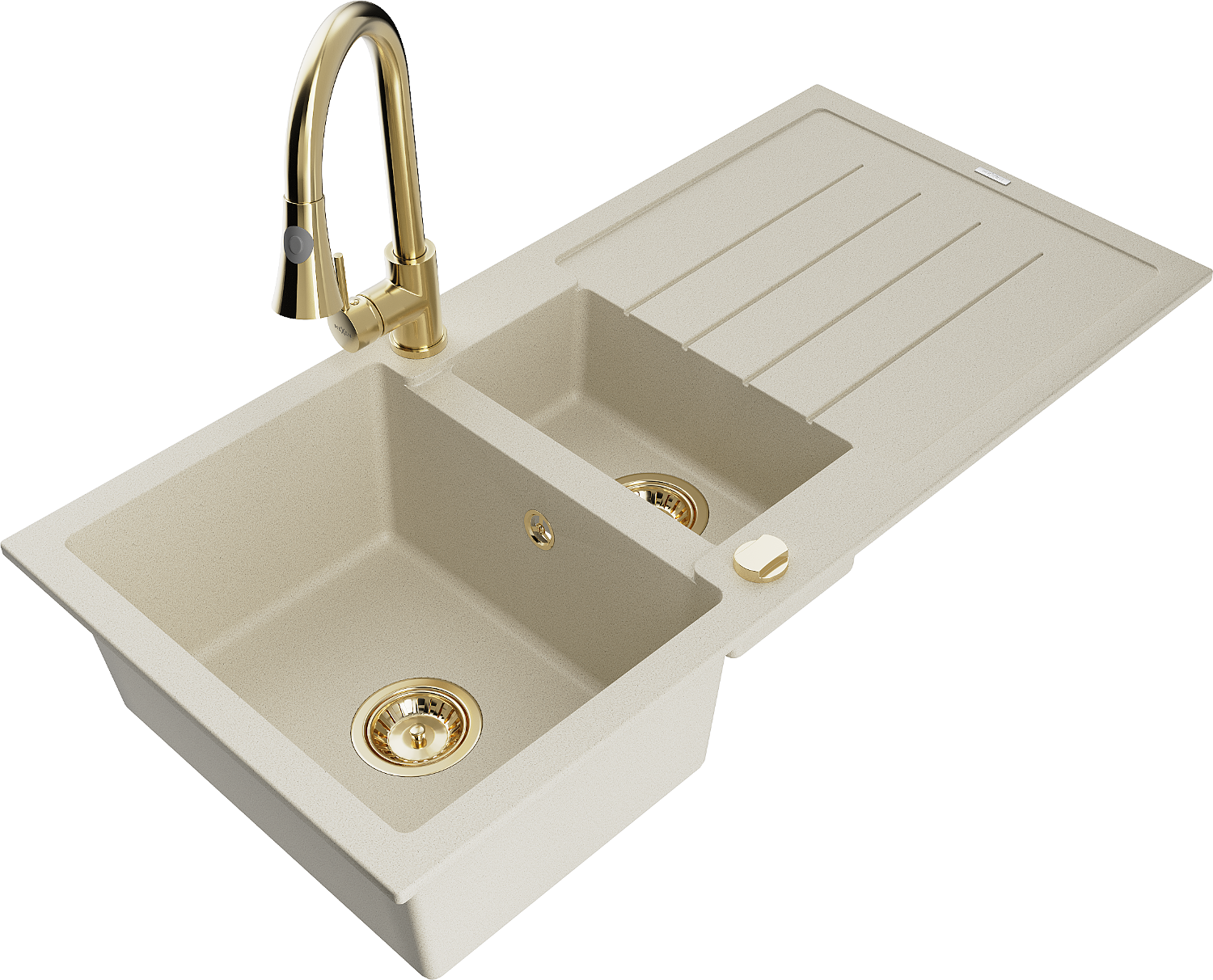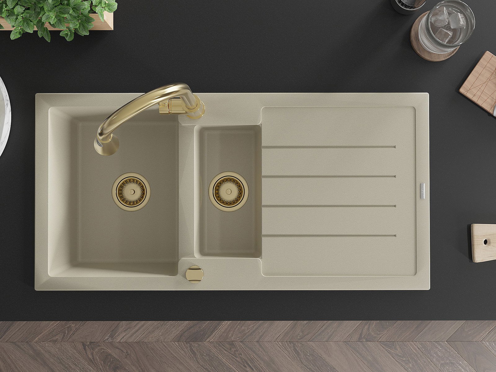 Mexen Andres kuchynský drez granitový 1,5-komorový s odkvapkávačom a kuchynskou batériou Elia, béžový - 6515-69-670101-50