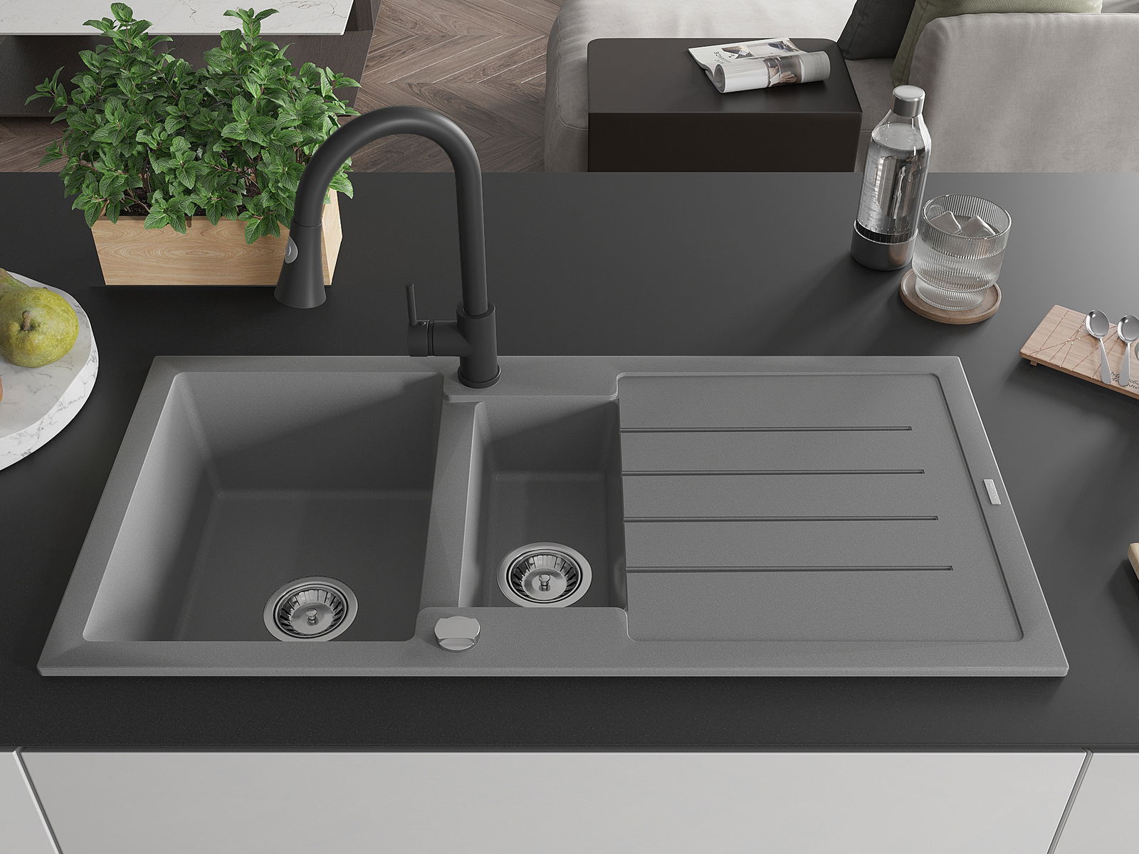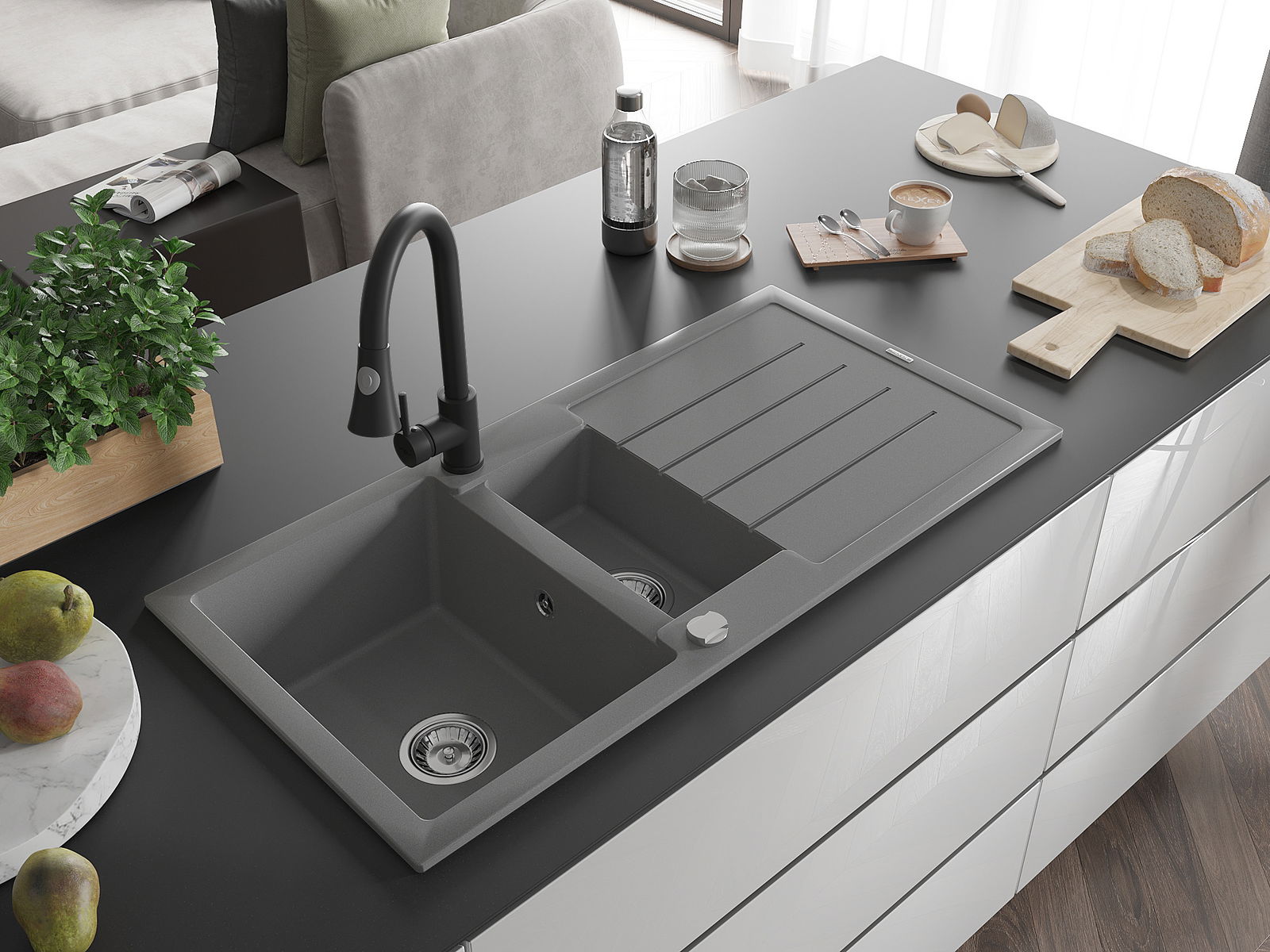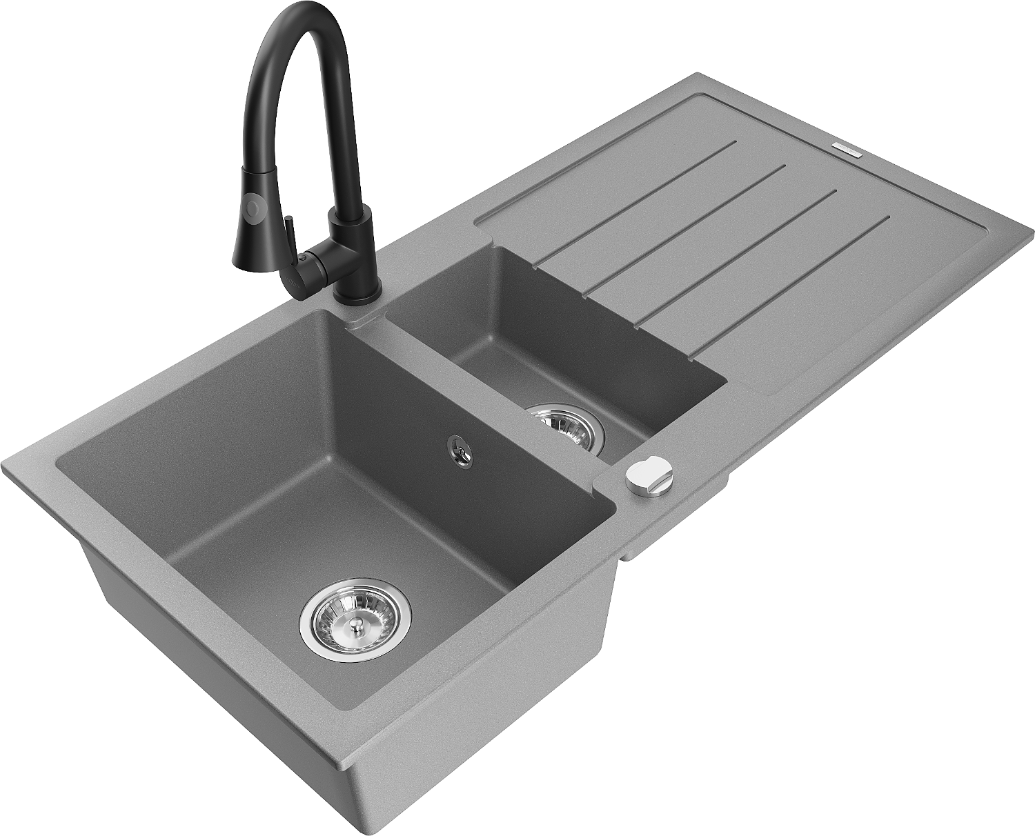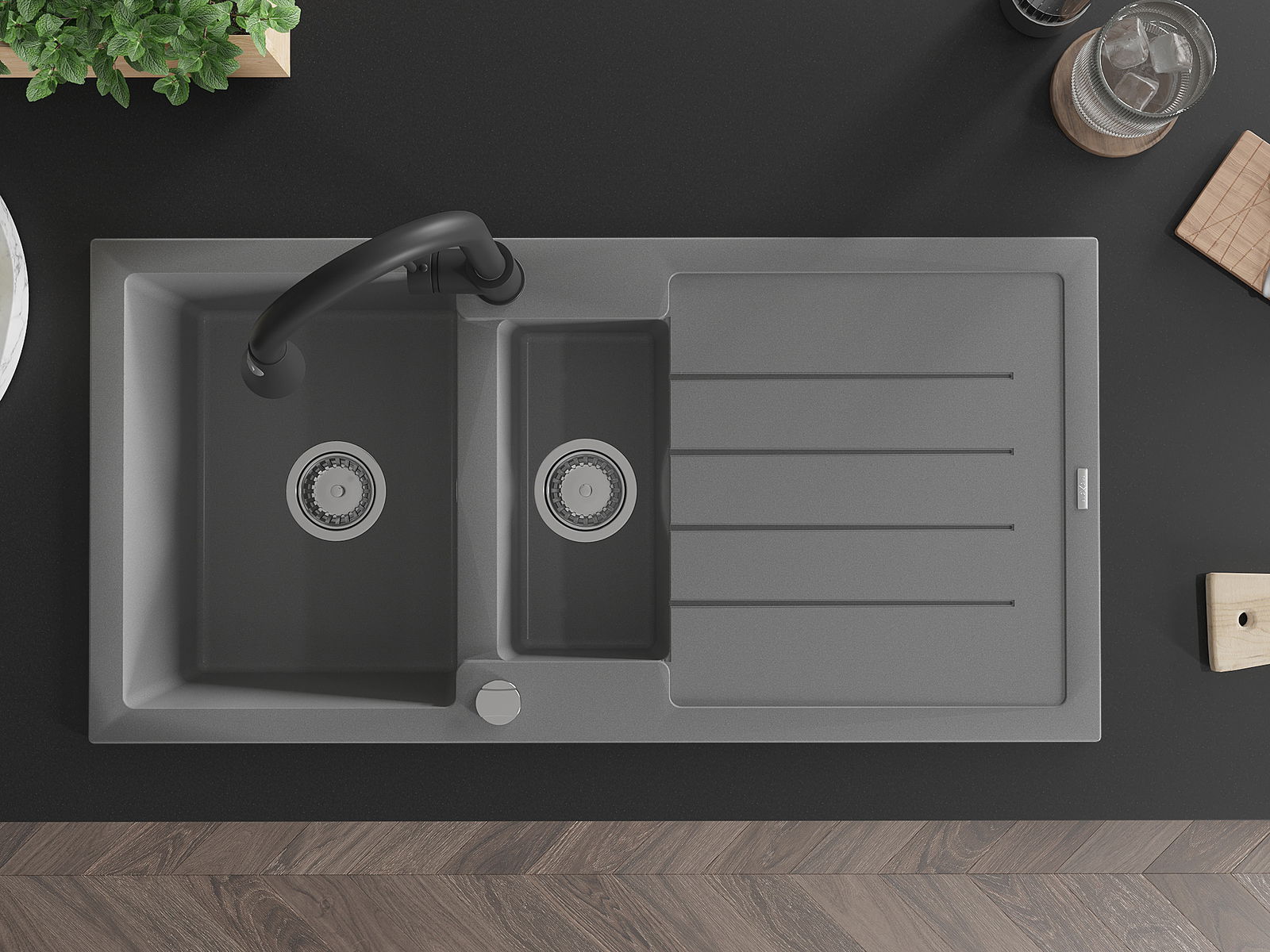 Mexen Andres kamenný drez 1,5-komorový s odkvapkávačom a kuchynskou batériou Elia, sivý - 6515-71-670101-70