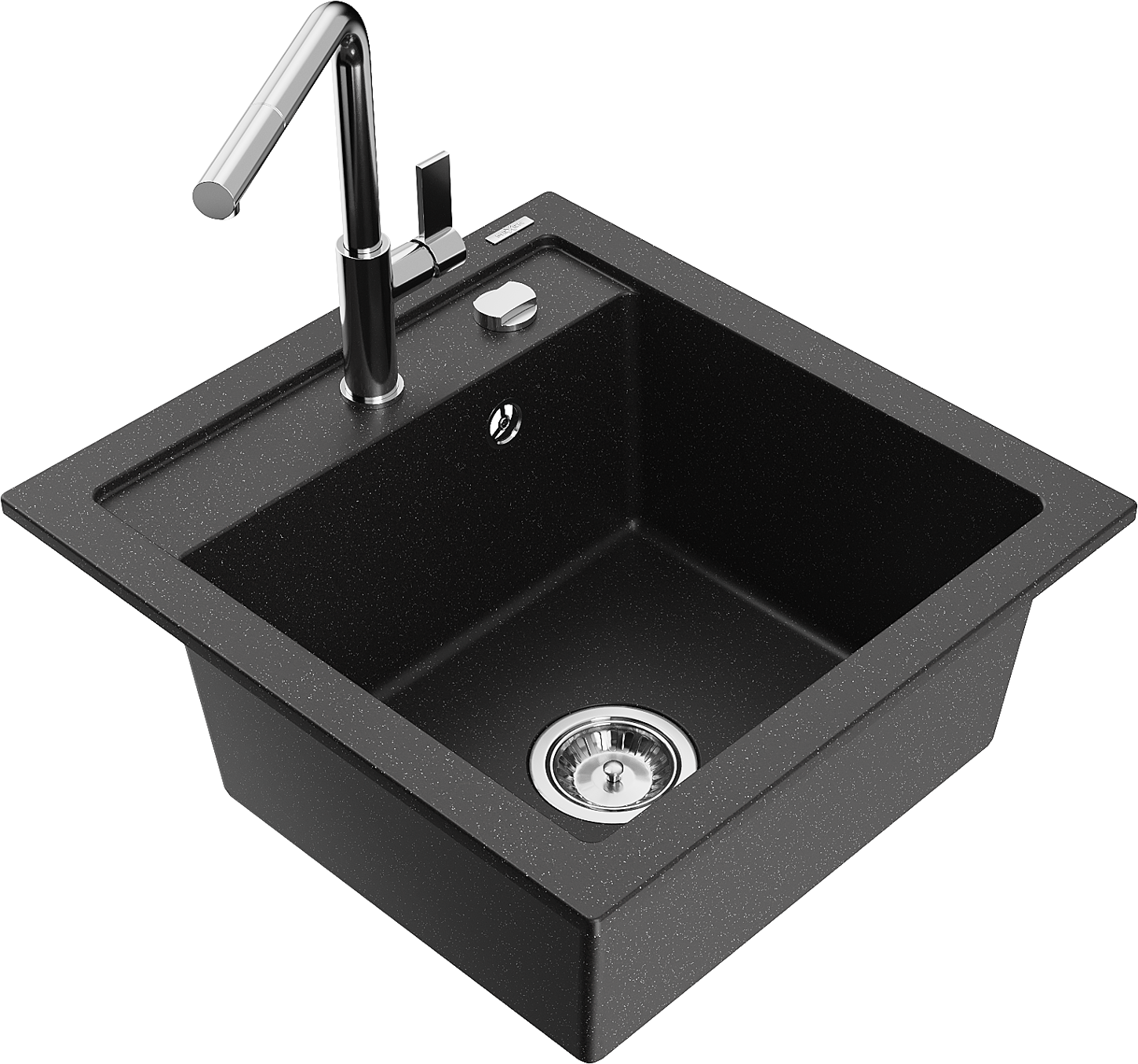 Mexen Vito jednokomorový žulový drez s kuchynskou batériou Flora, čierny/strieborný metalik - 6503-73-670401-00