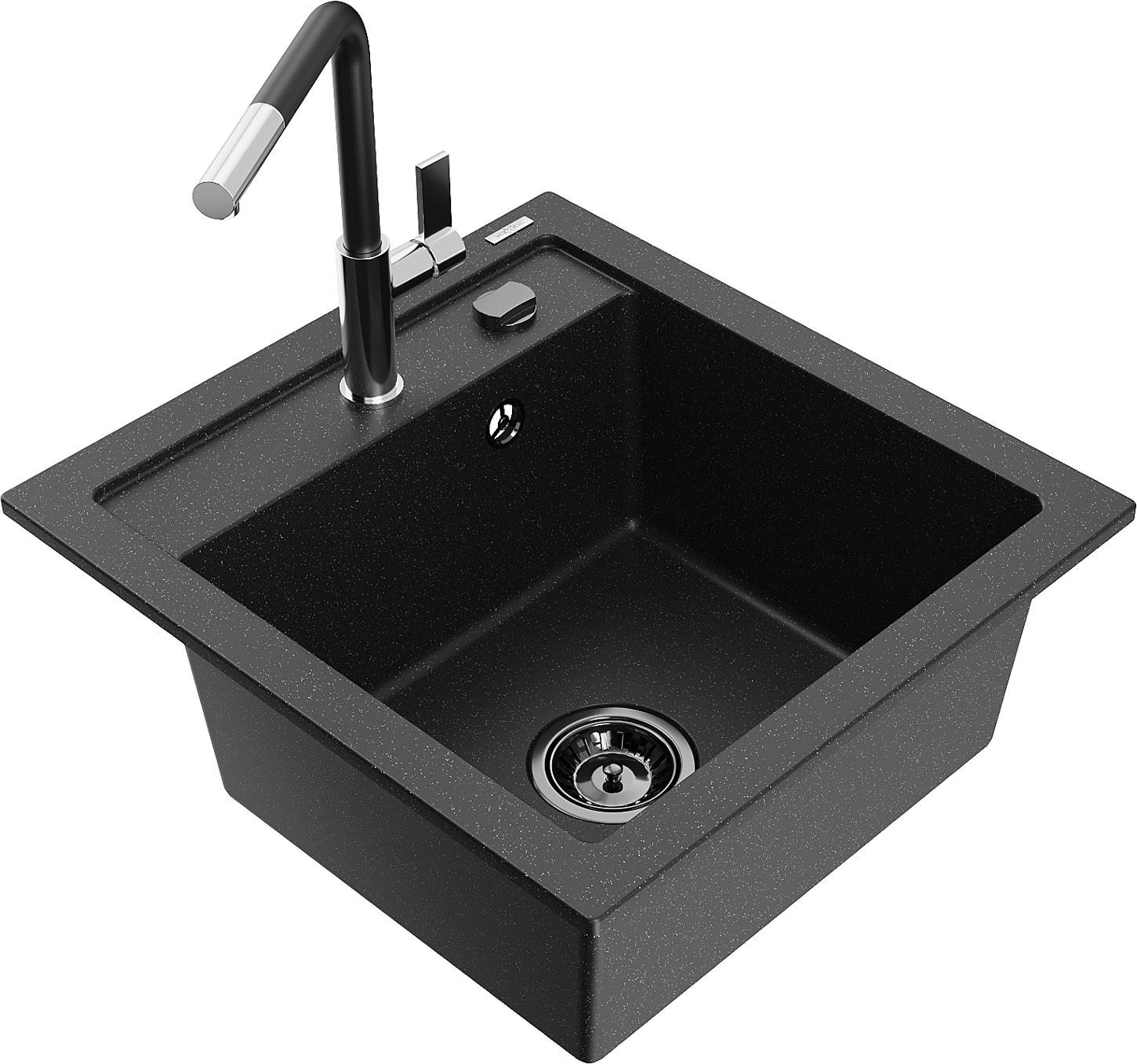 Mexen Vito 1-komorový granitový drez s kuchynskou batériou Flora, čierny/strieborný metalik - 6503-73-670401-07-B