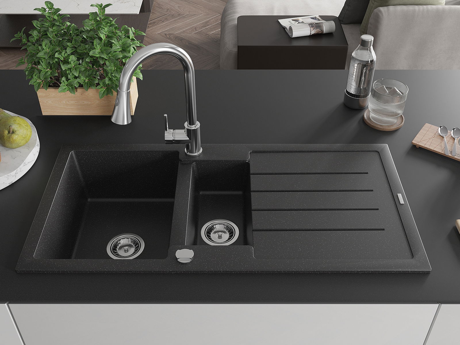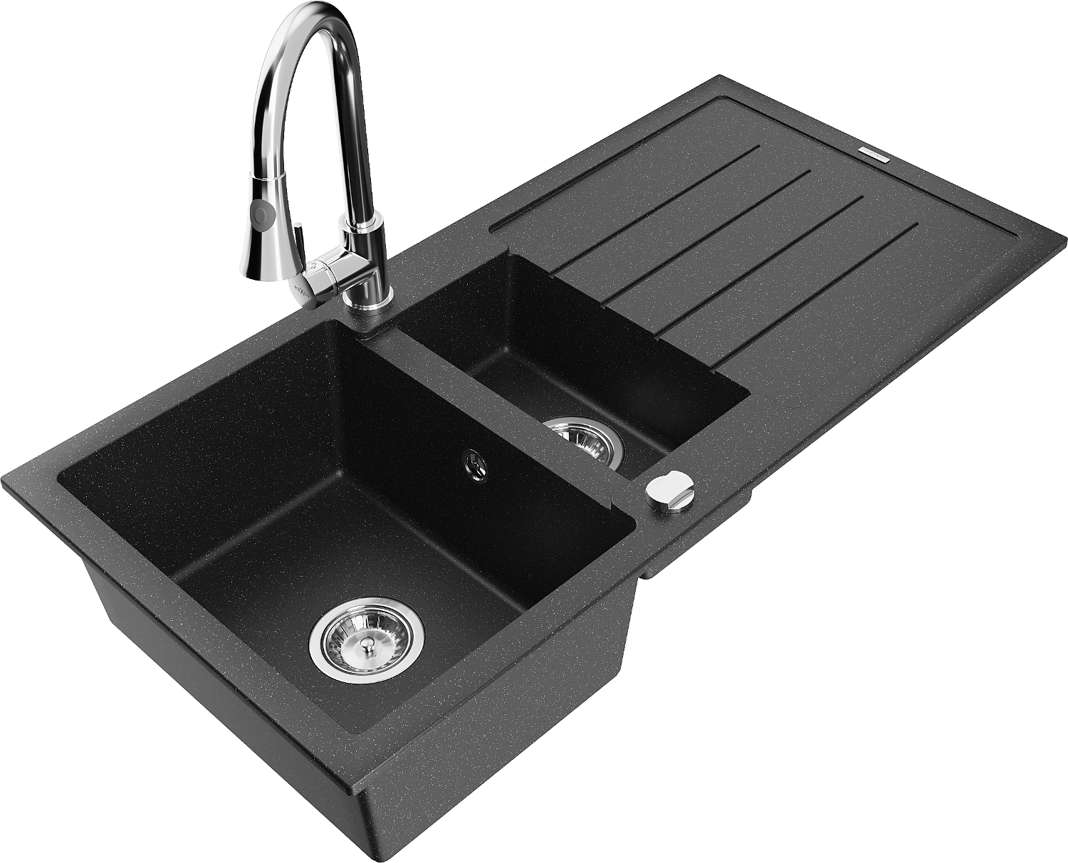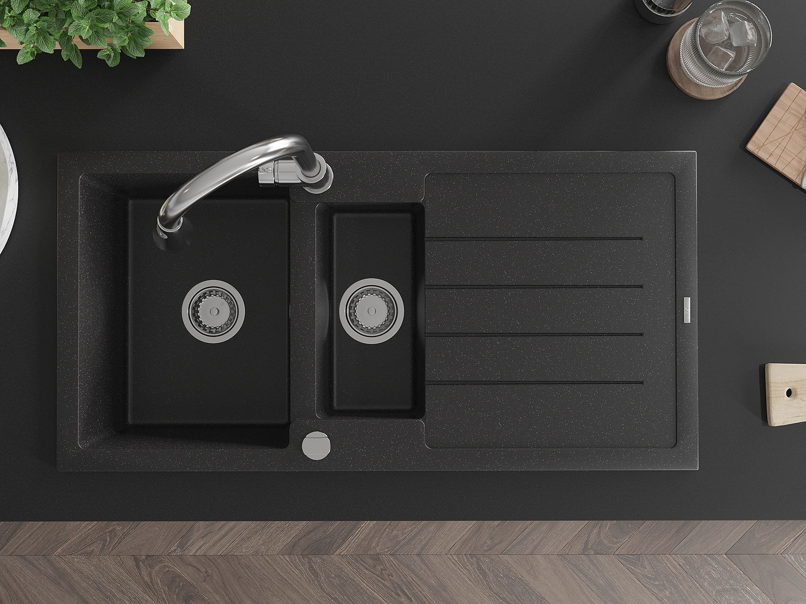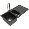 Mexen Andres granitový kuchynský drez s 1,5 komorami, odkvapávačom a kuchynskou batériou Elia, čierno/strieborný