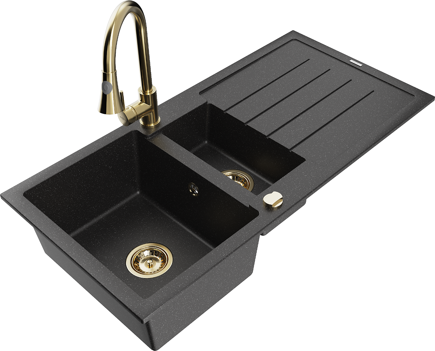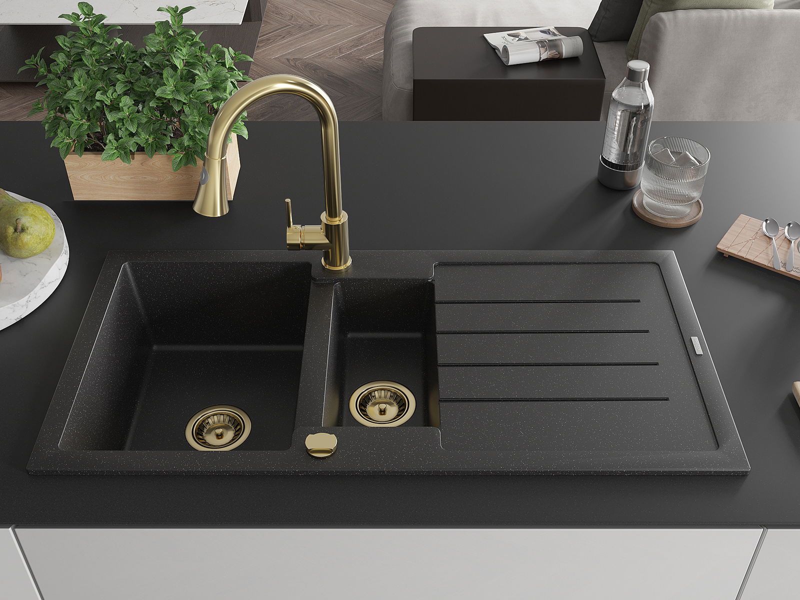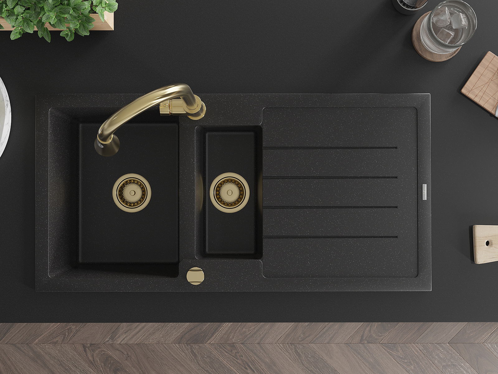 Mexen Andres žulový kuchynský dvojdrez s odkvapom a kuchynskou batériou Elia, čierny/strieborný metalický