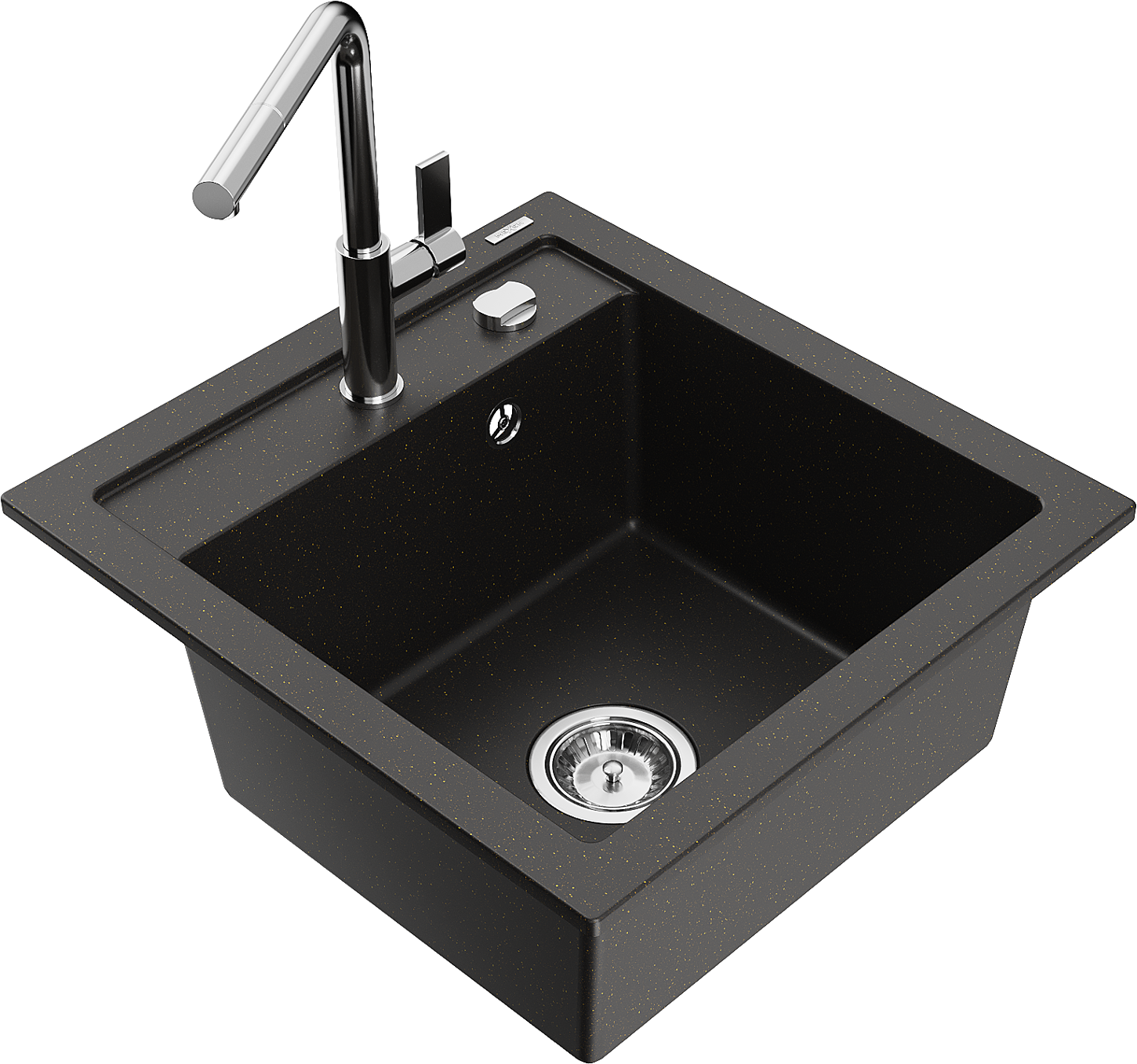 Mexen Vito žulový drez s 1 komorou s kuchynskou batériou Flora, čierny/zlatý metalík - 6503-75-670401-00