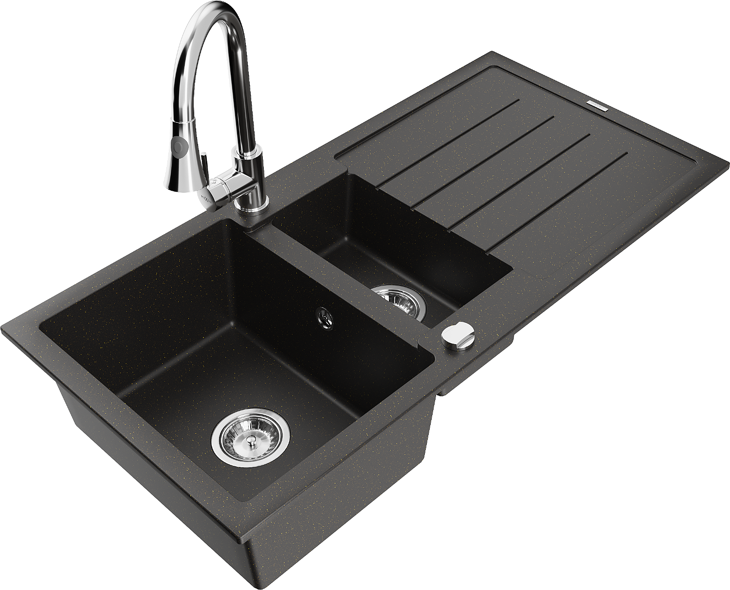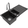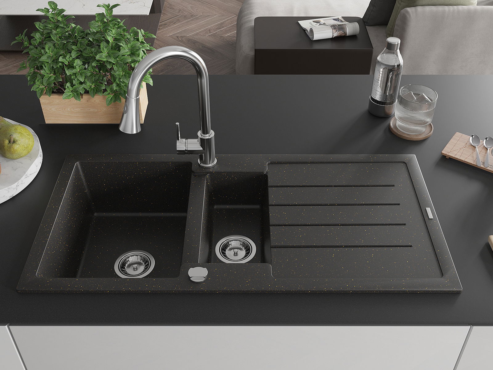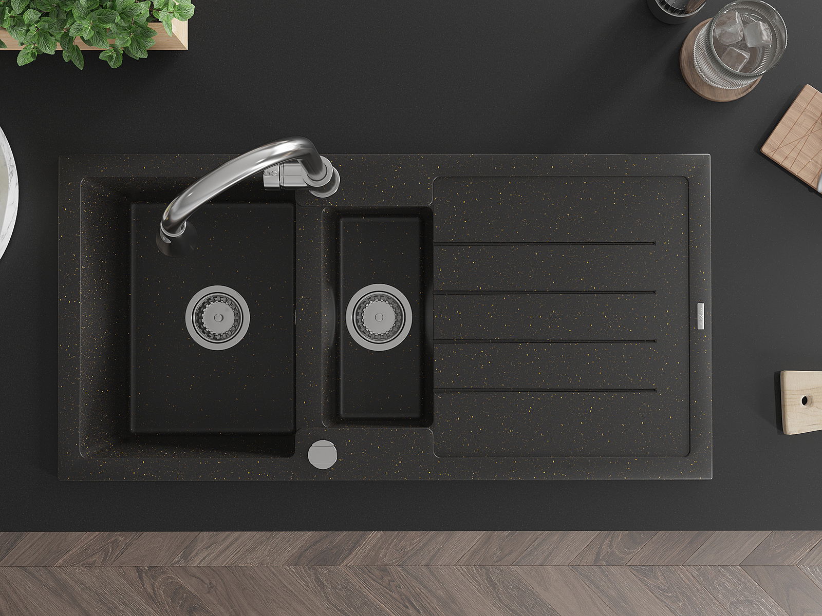 Mexen Andres žulový drez 1,5-komorový s odkvapkávačom a kuchynskou batériou Elia, čierny/zlatý metalik - 6515-75-670101-00