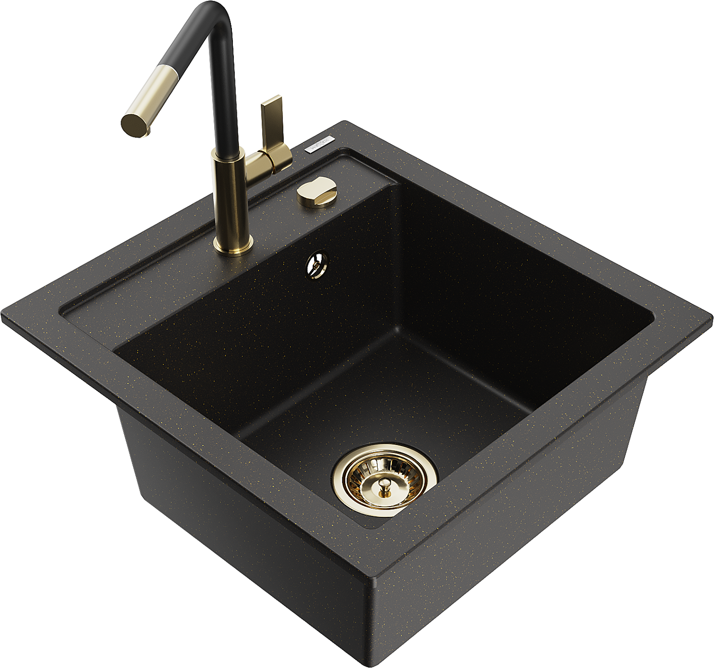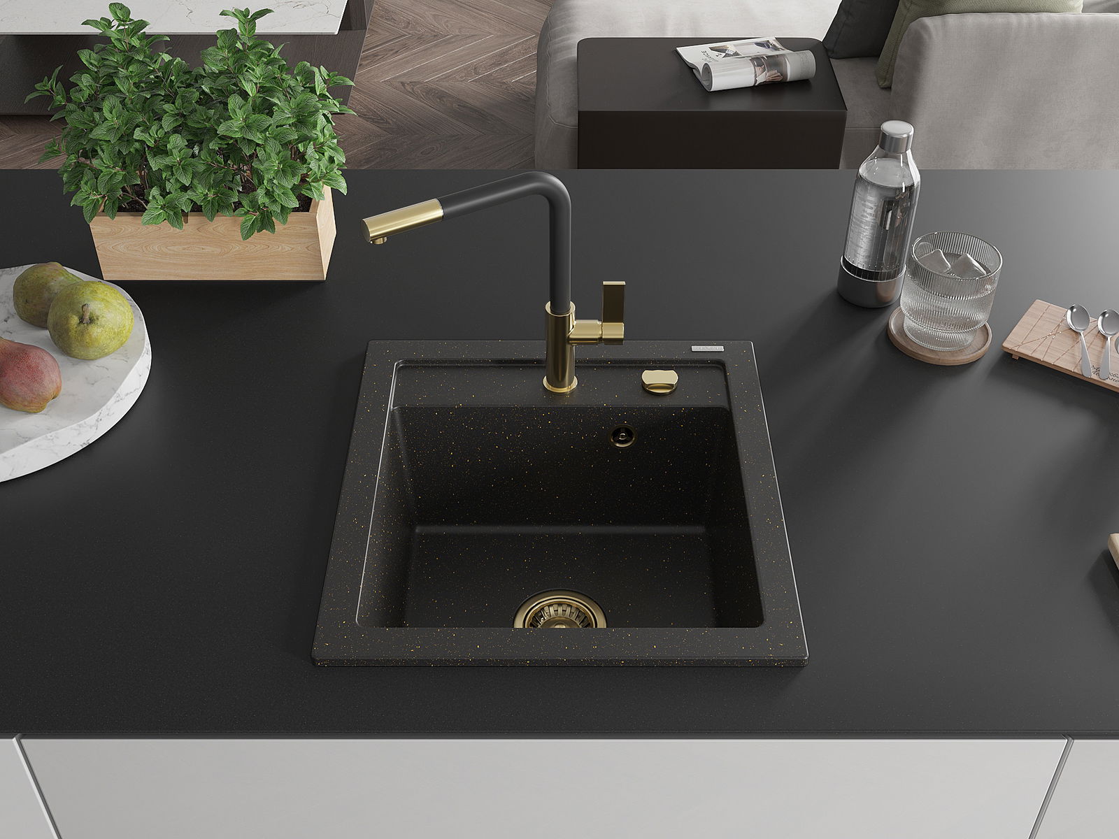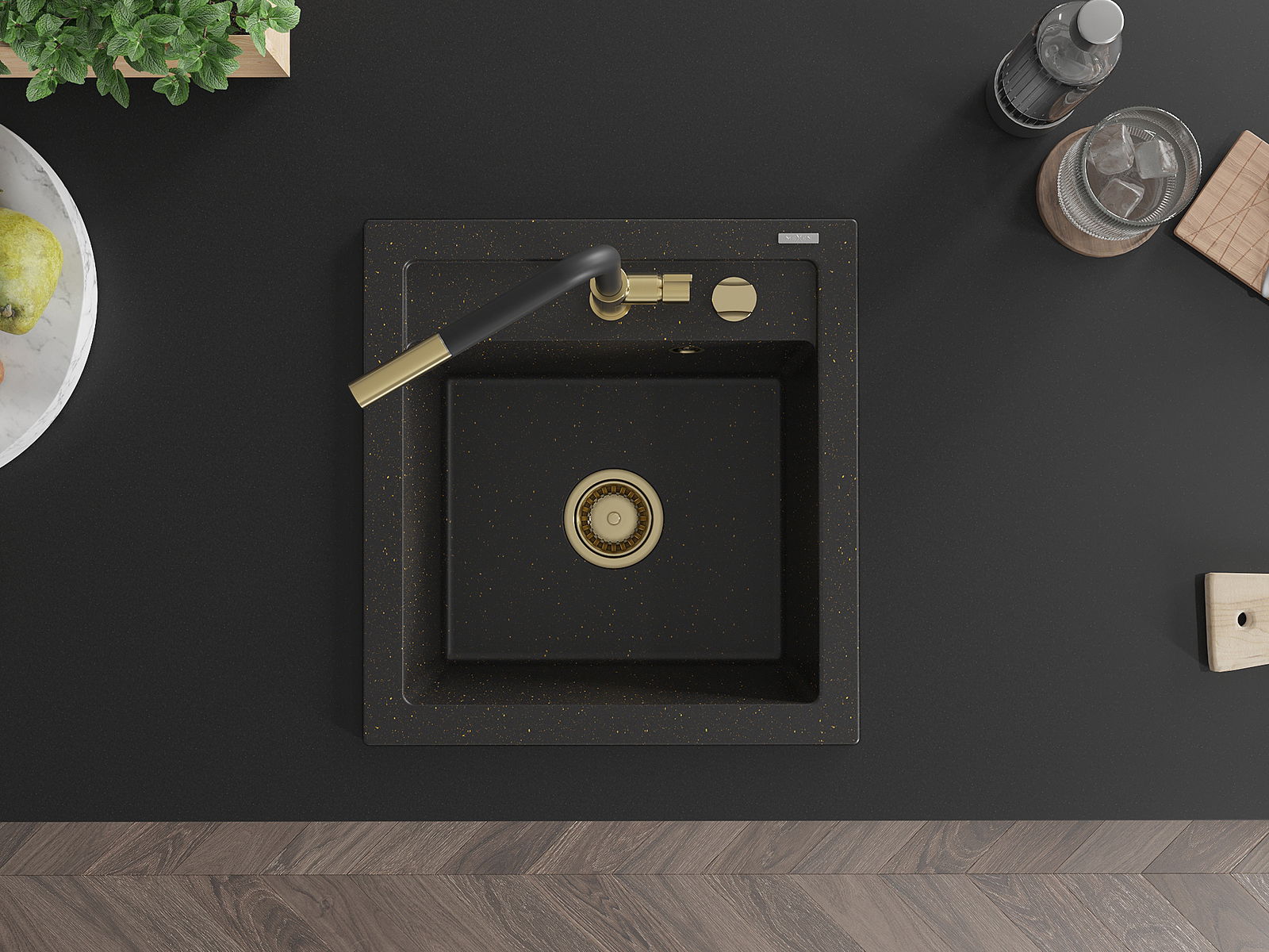 Mexen Vito granitový kuchynský drez 1-komorový s kuchynskou batériou Flora, čierny/zlatý metalický - 6503-75-670401-57-G