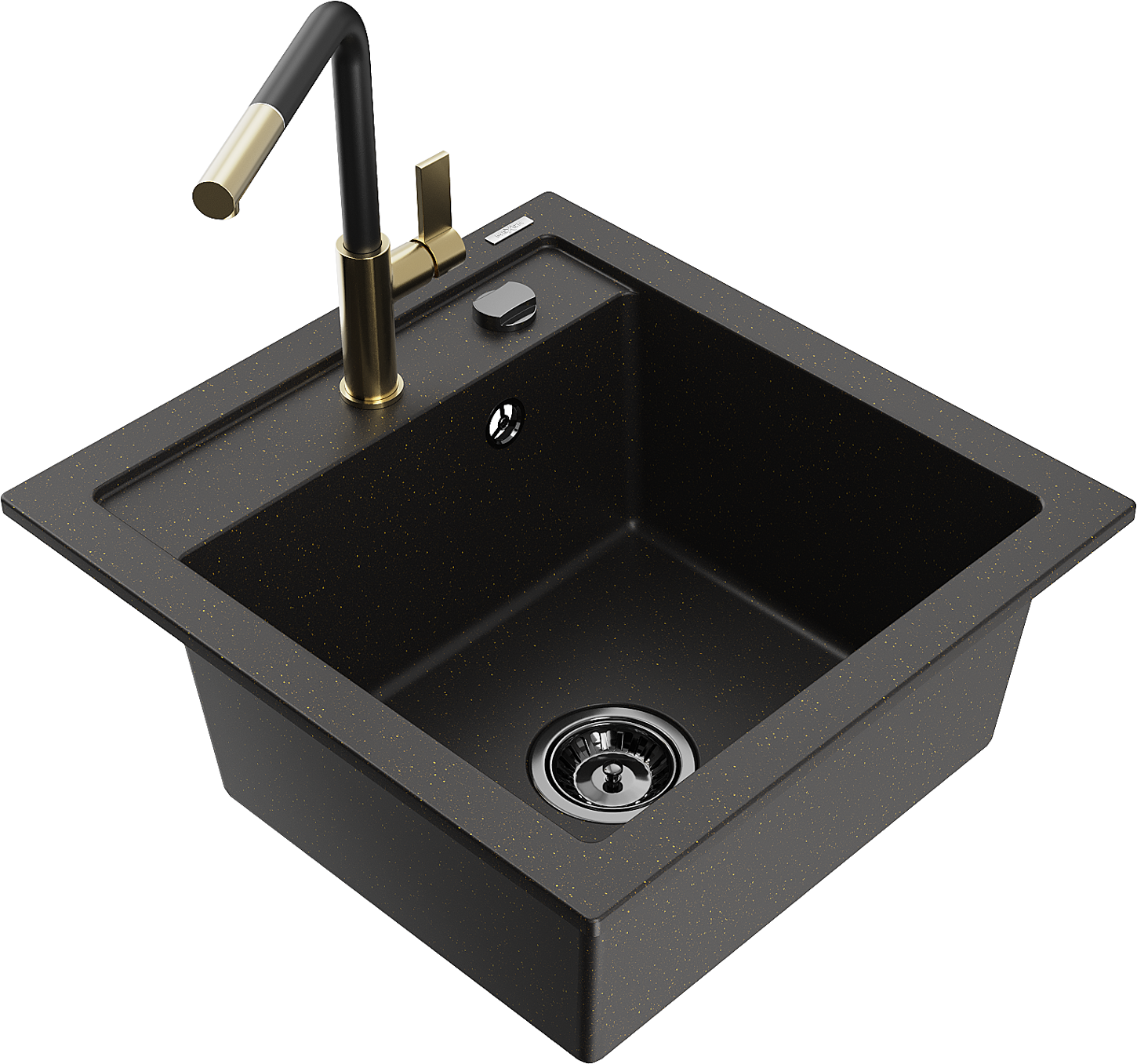 Mexen Vito žulový drez 1-komorový s kuchynskou batériou Flora, čierny/zlatý metalik - 6503-75-670401-57-B