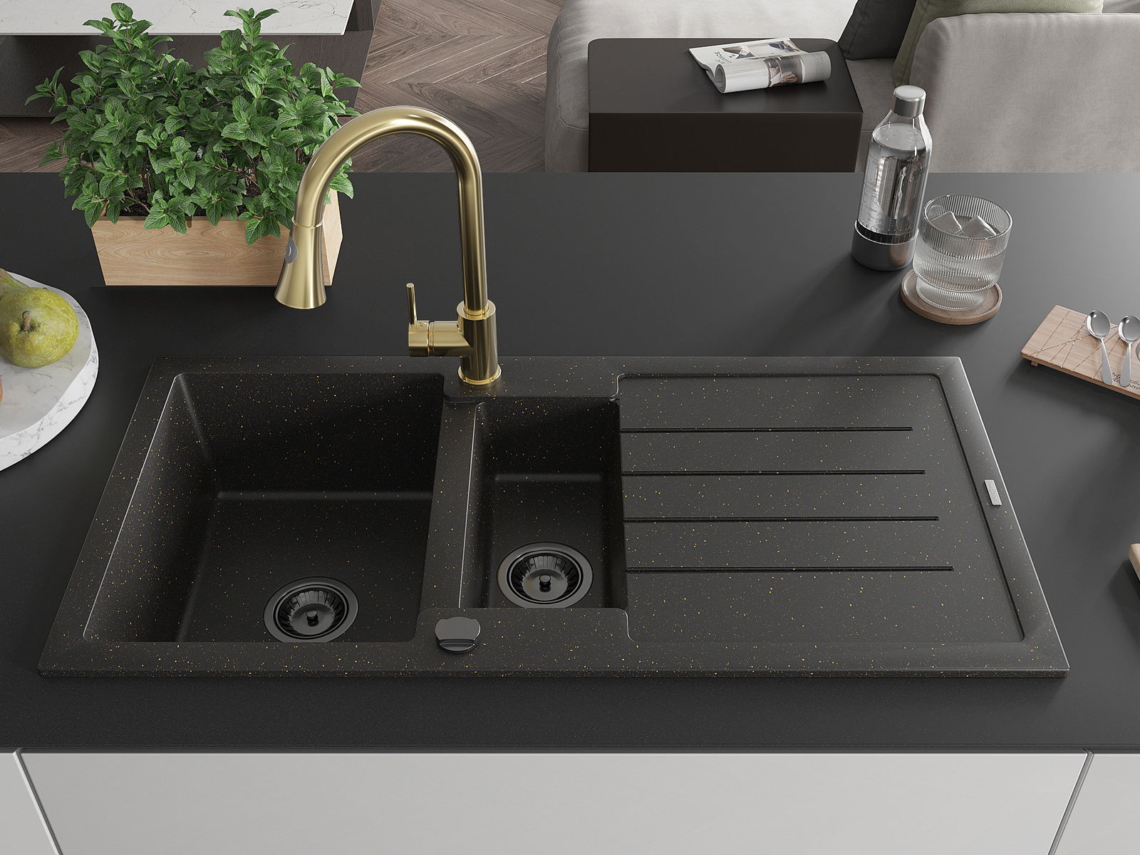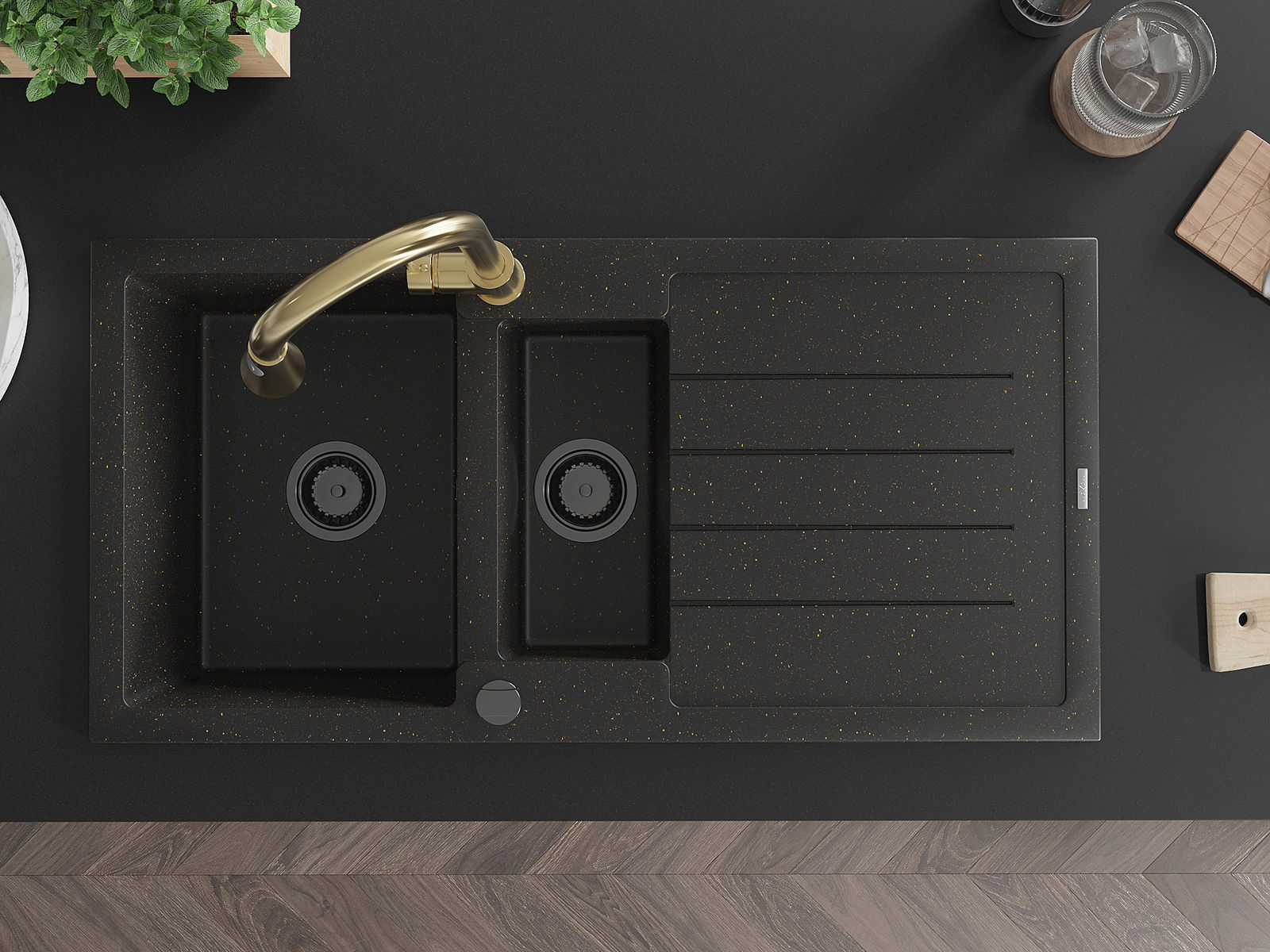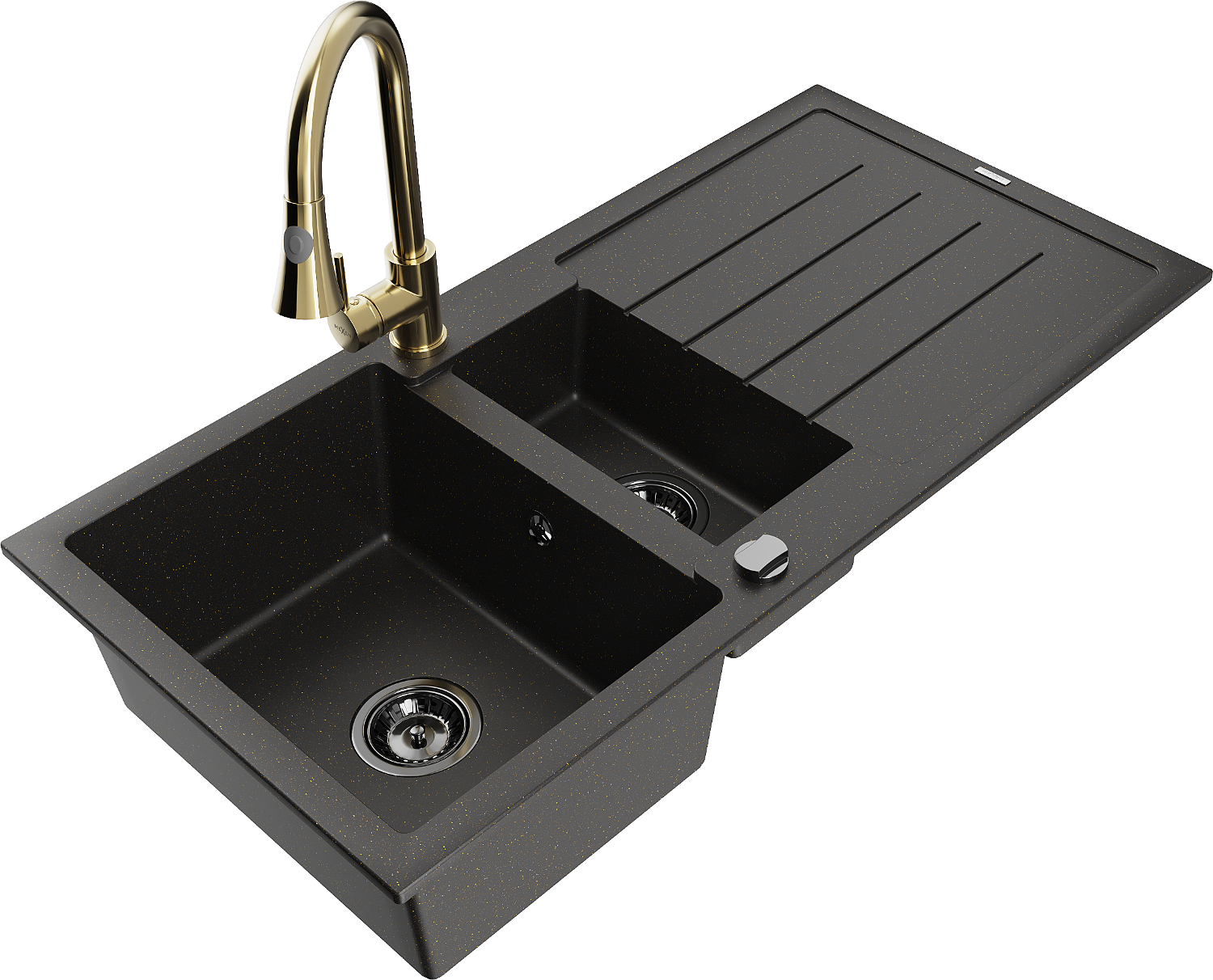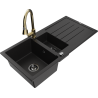 Mexen Andres žulový drez 1,5-komorový s odkvapkávačom a kuchynská batéria Elia, čierny/zlatý metalik - 6515-75-670101-50-B