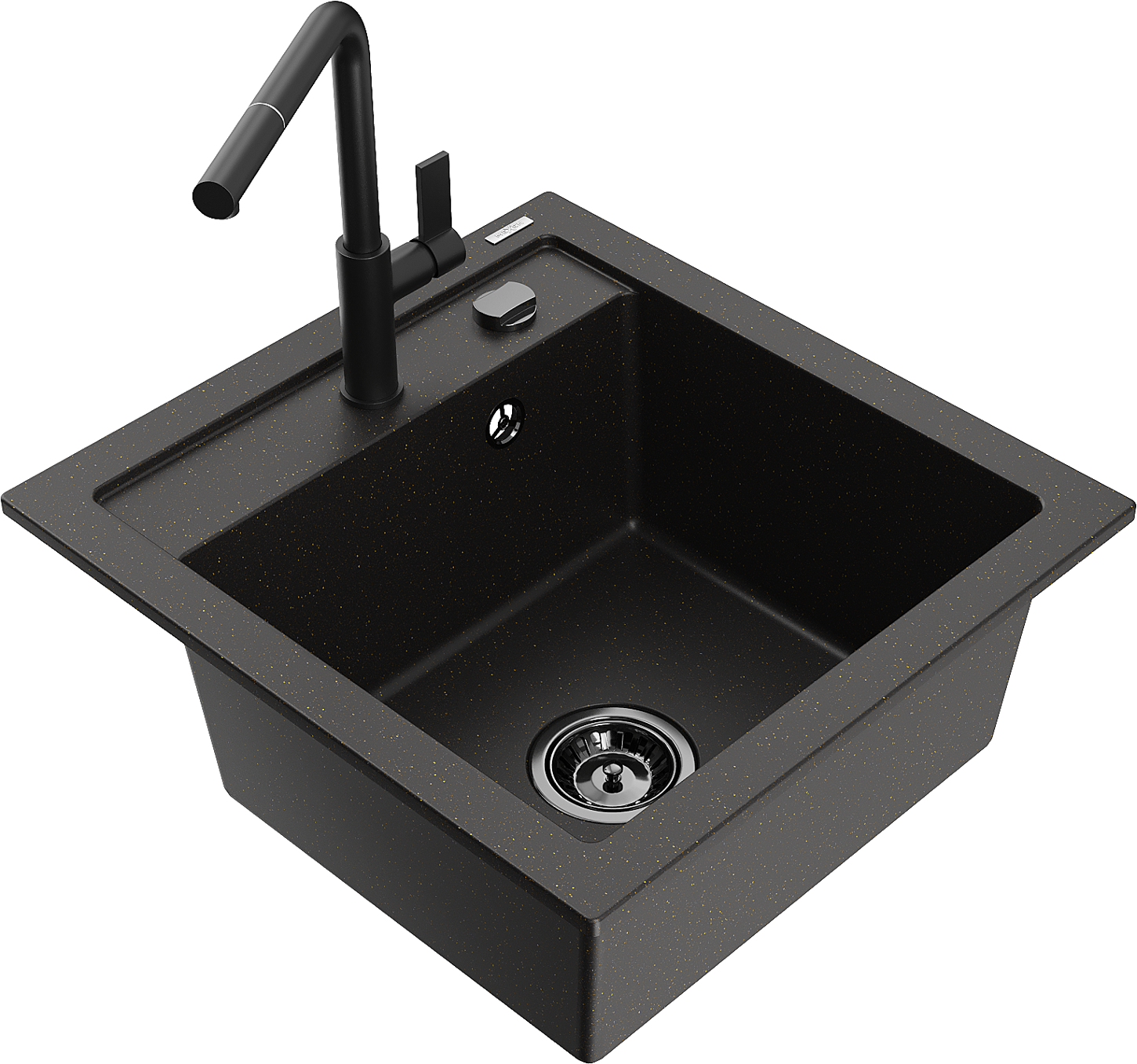 Mexen Vito žulový drez 1-komorový s kuchynskou batériou Flora, čierny/zlatý metalik - 6503-75-670401-70-B