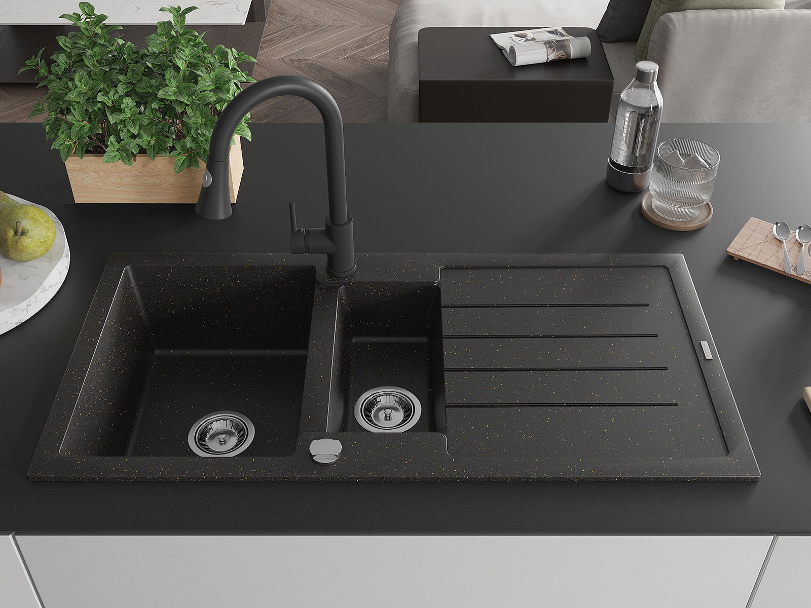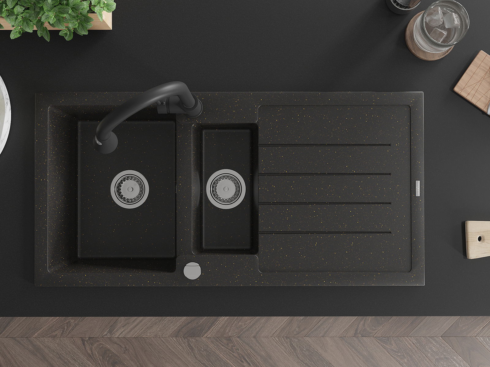 Mexen Andres žulový drez 1,5-komorový s odkvapkávačom a kuchynskou batériou Elia, čierny/zlatý metalický - 6515-75-670101-70