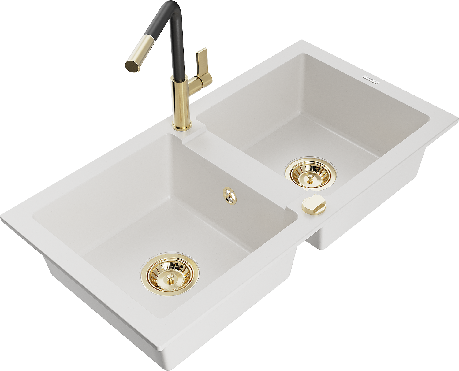 Mexen Mario kameninový drez 2-komorový s kuchynskou batériou Flora, biely - 6504-20-670401-57-G