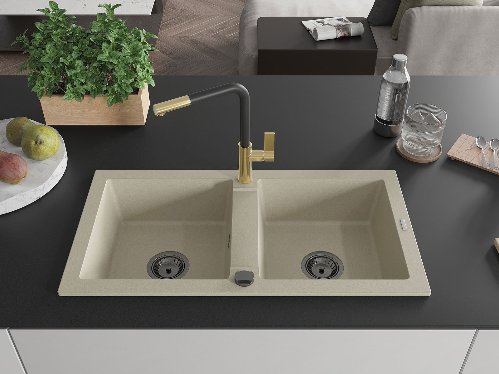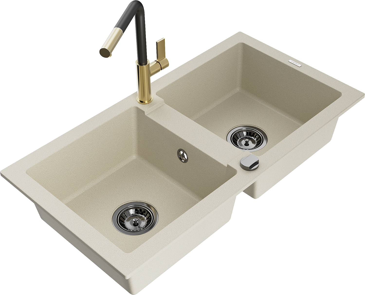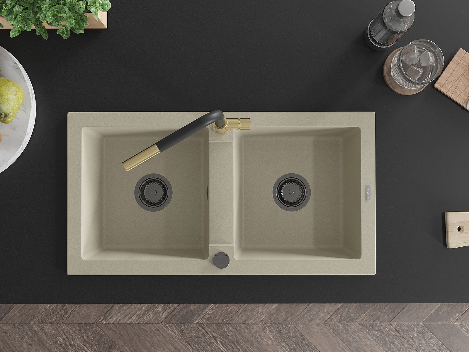 Mexen Mario dvojkomorový granitový drez s kuchynskou batériou Flora, béžový - 6504-69-670401-57-B