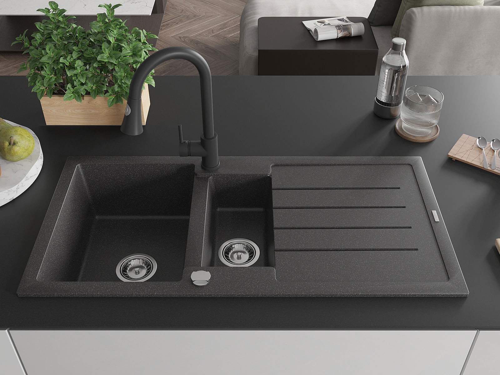 Povrch umývadla je odolný voči škvrnám a sfarbeniu, vďaka čomu sa ľahko čistí a zachováva si svoju farbu po dlhú dobu. Estetický a prakticky dopĺňajúci každú kuchyňu.