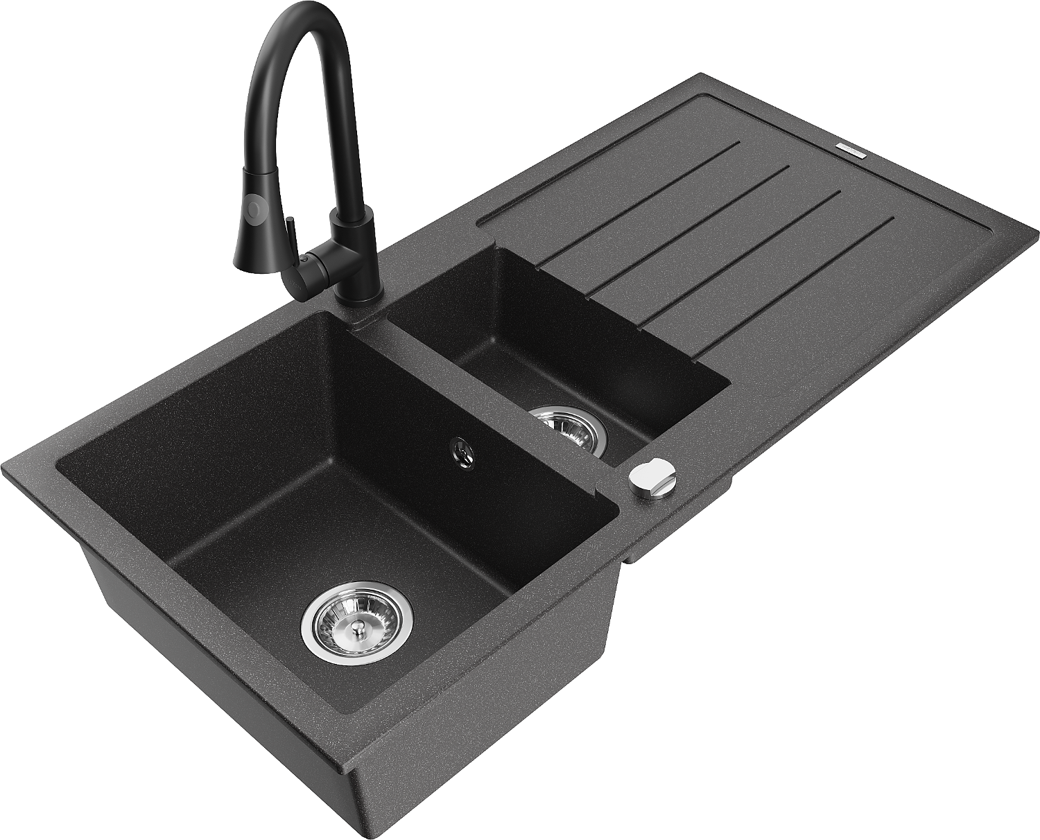 Mexen Andres granitový drez 1,5-komorový s odkvapkávačom a kuchynskou batériou Elia, čierny škvrnitý - 6515-76-670101-70
