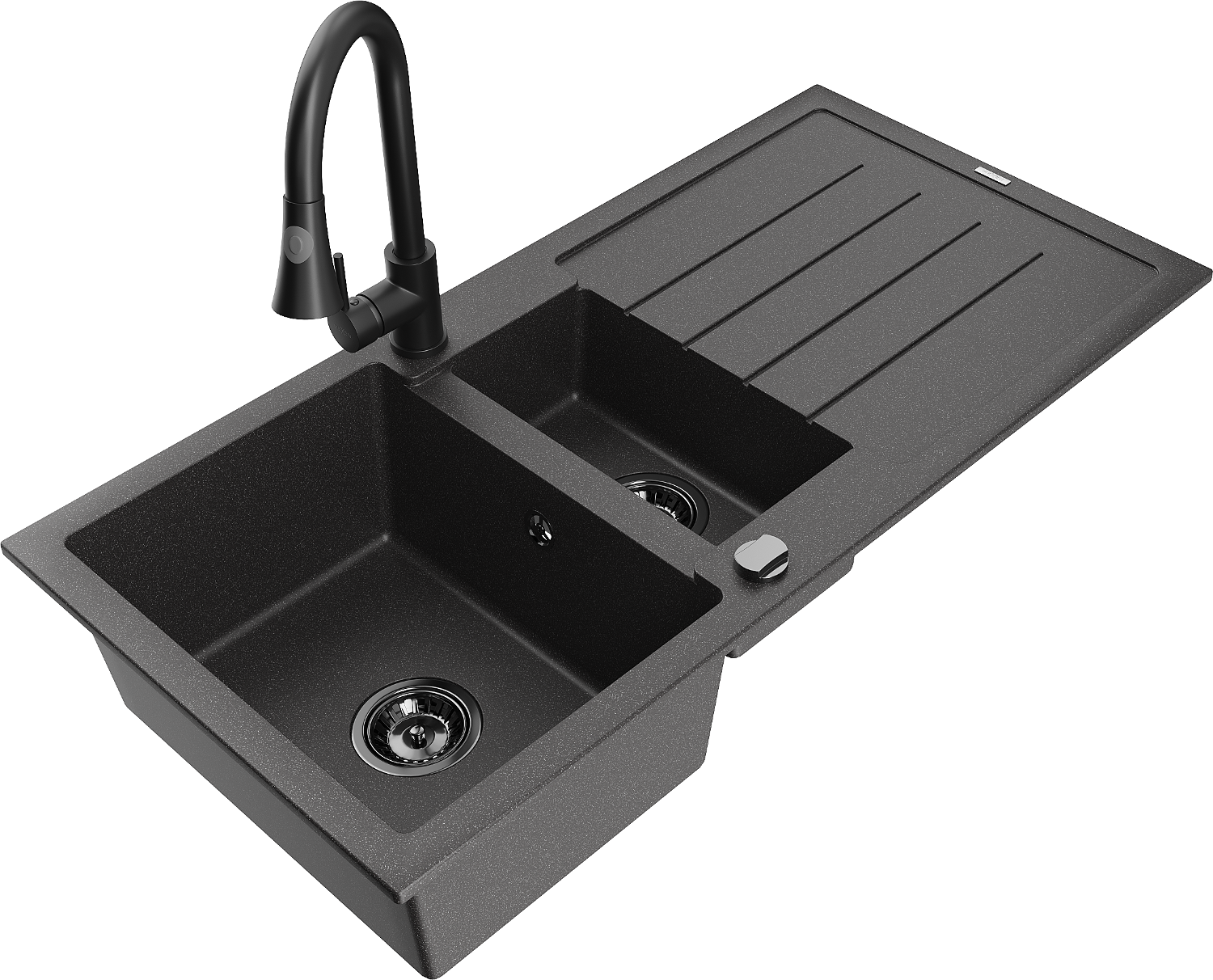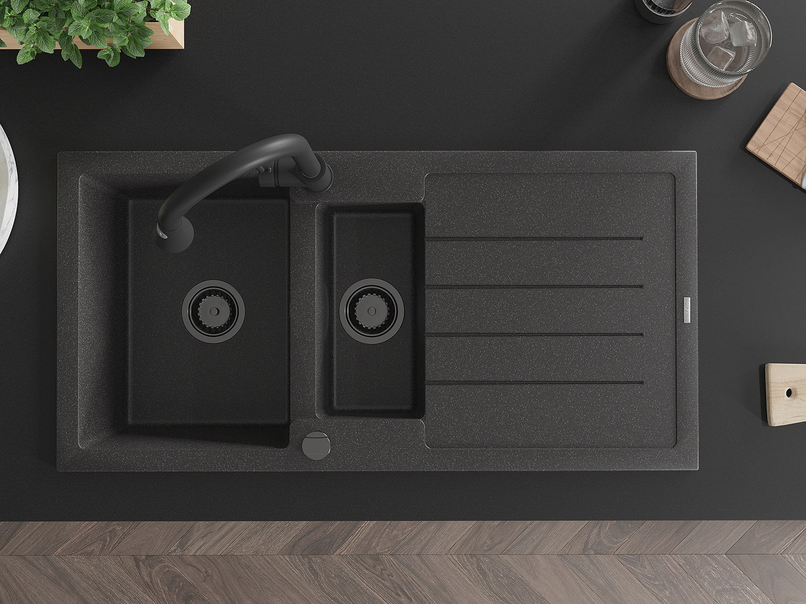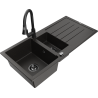Mexen Andres žulový drez 1,5-komorový s odkvapkávačom a kuchynskou batériou Elia, čierny škvrnami - 6515-76-670101-70-B