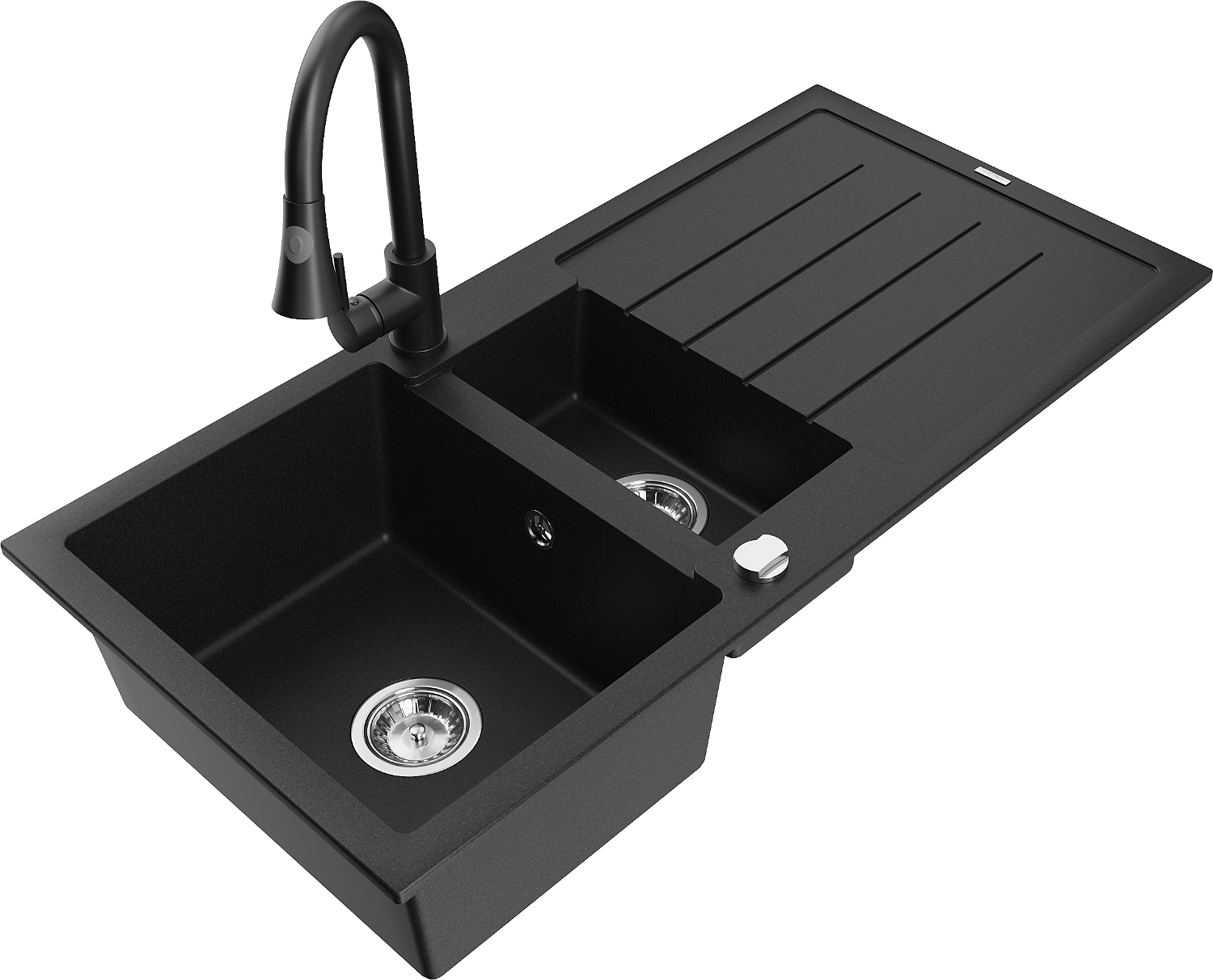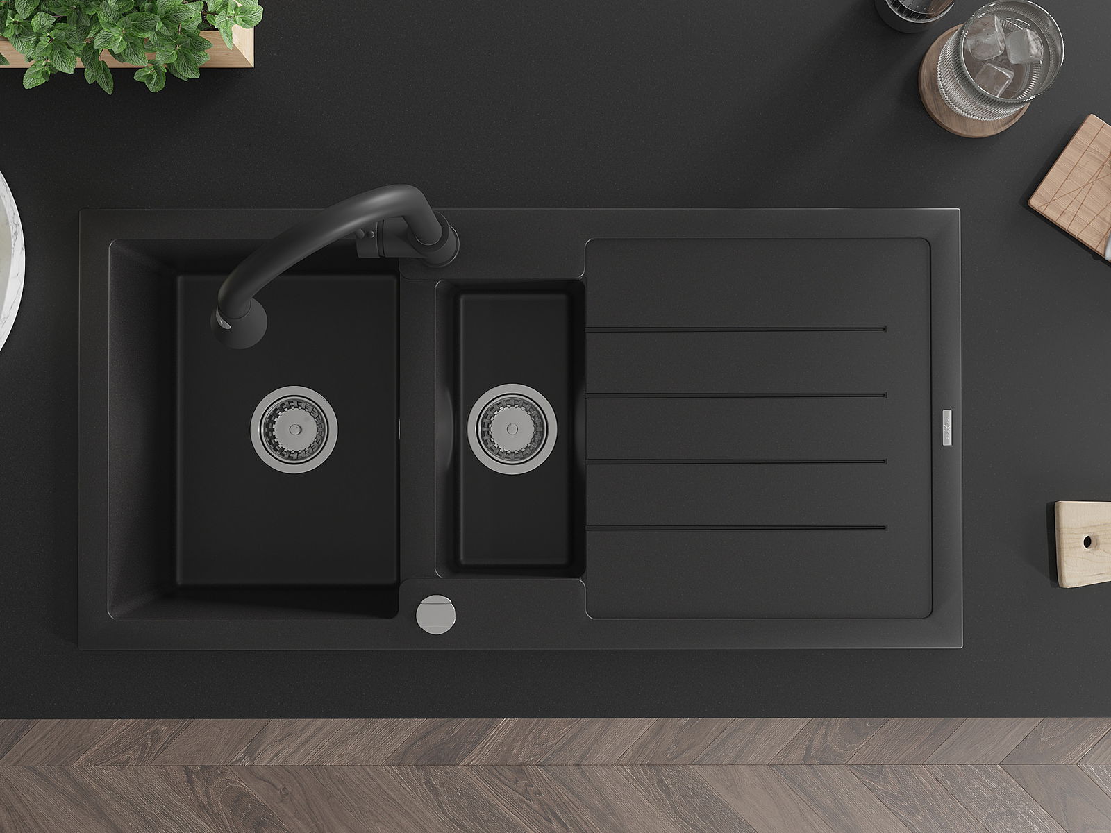 Mexen Andres granitový drez 1,5-komorový s odkvapom a kuchynskou batériou Elia, čierny - 6515-77-670101-70