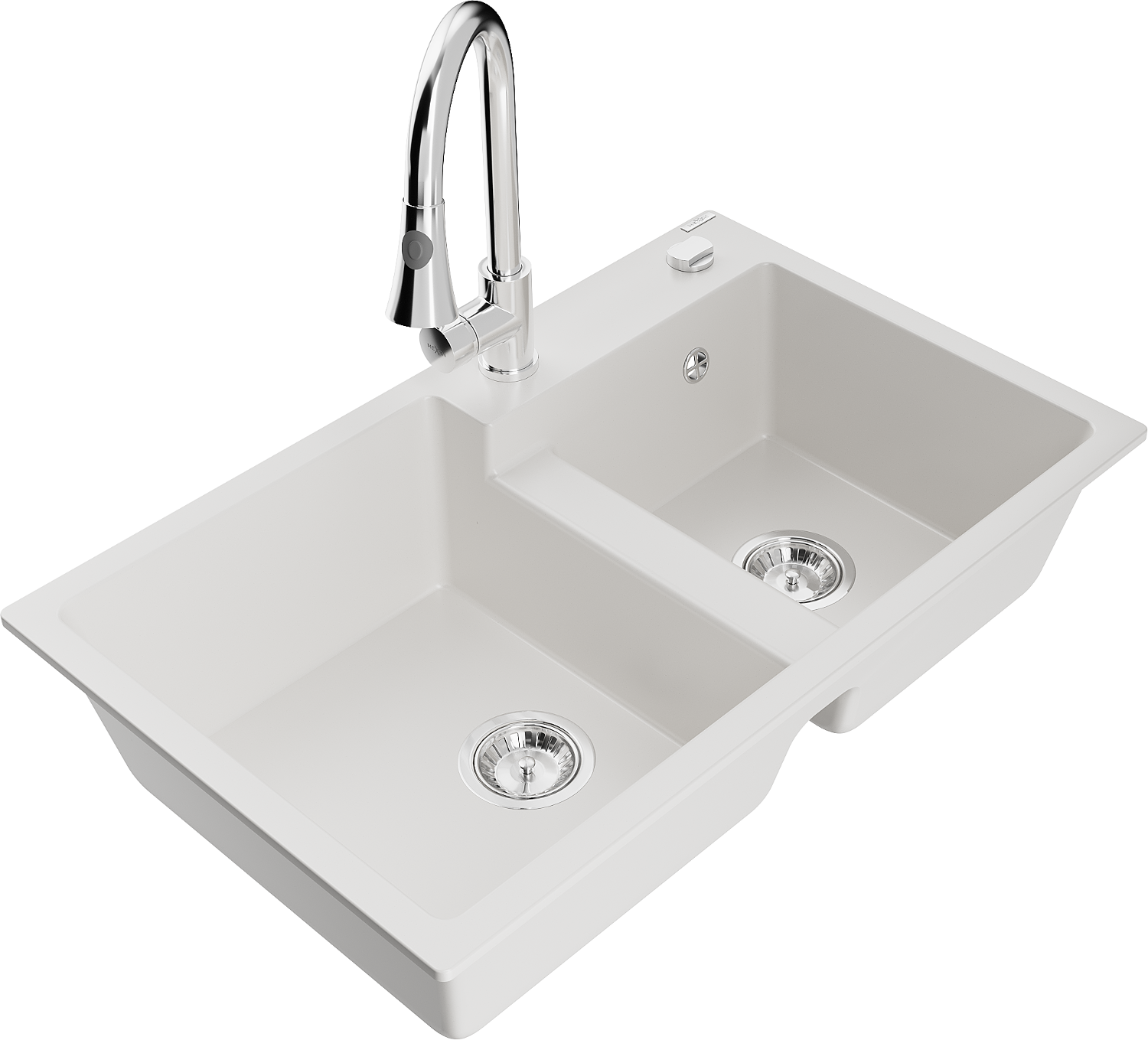 Mexen Tomas žulový drez s 2 komorami a kuchynskou batériou Elia, biely - 6516-20-670101-00