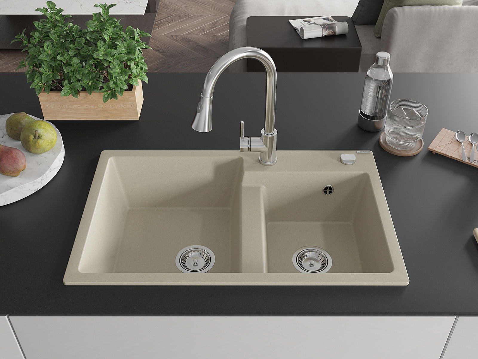 Povrch umývadla je odolný voči škvrnám a sfarbeniu, vďaka čomu sa ľahko čistí a zachováva si svoju farbu po dlhú dobu. Estetický a prakticky dopĺňajúci každú kuchyňu.