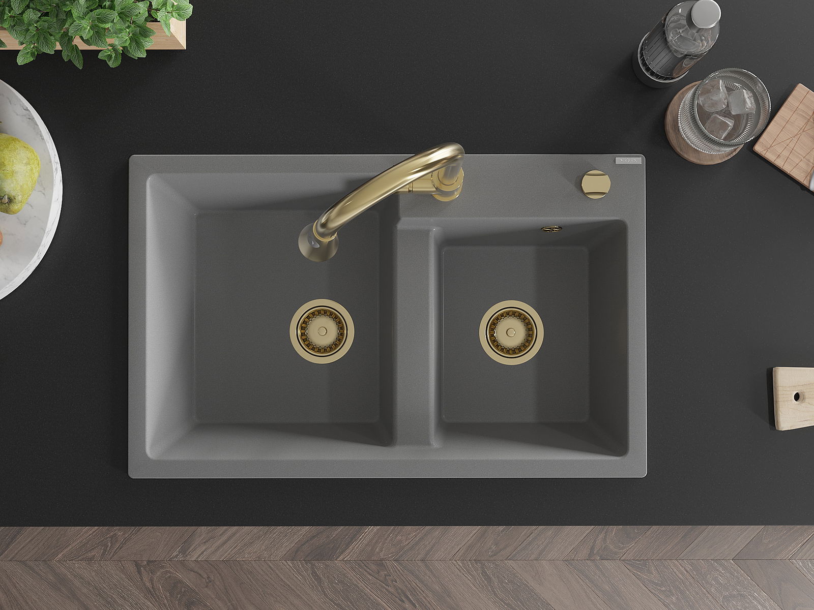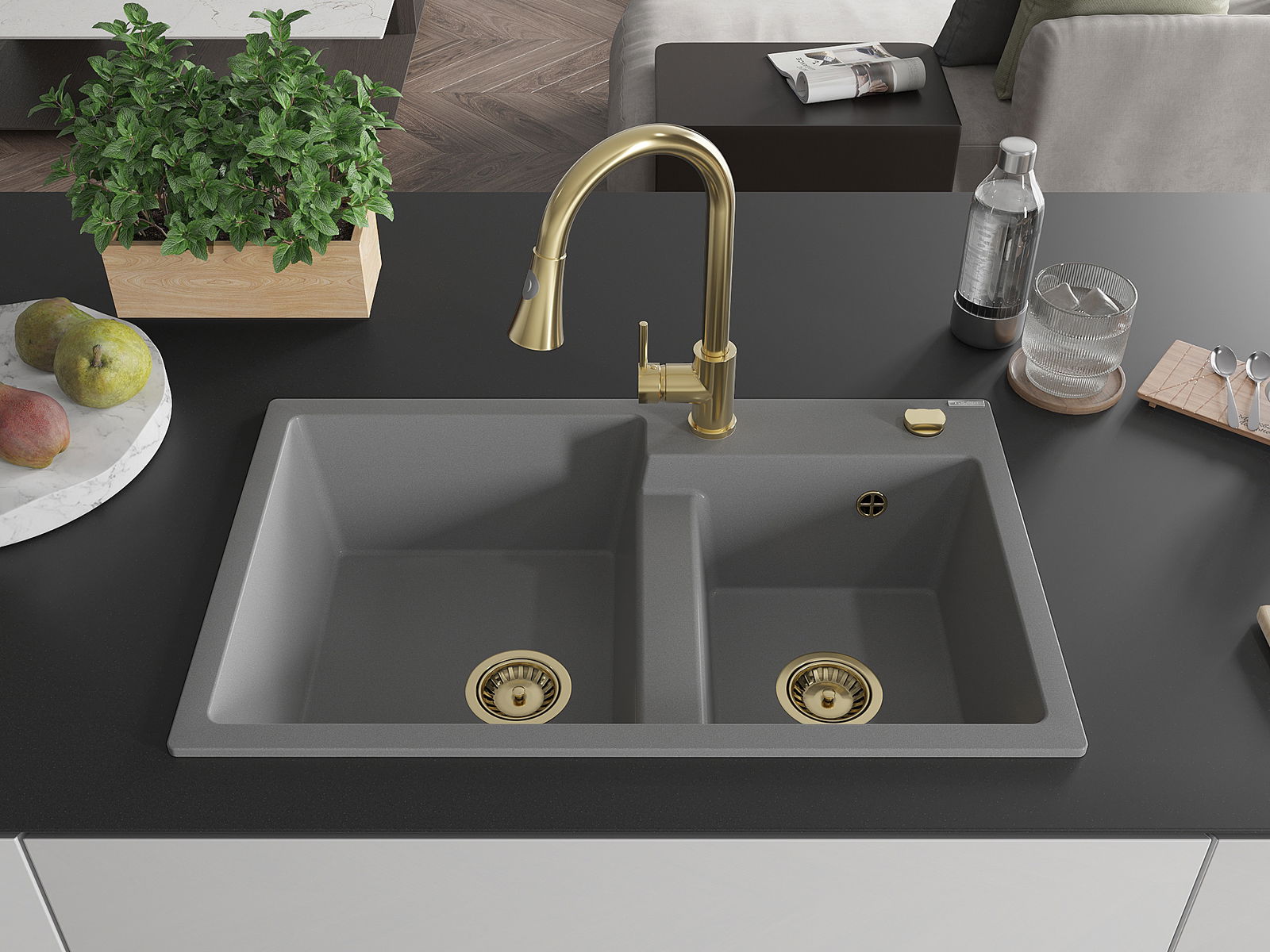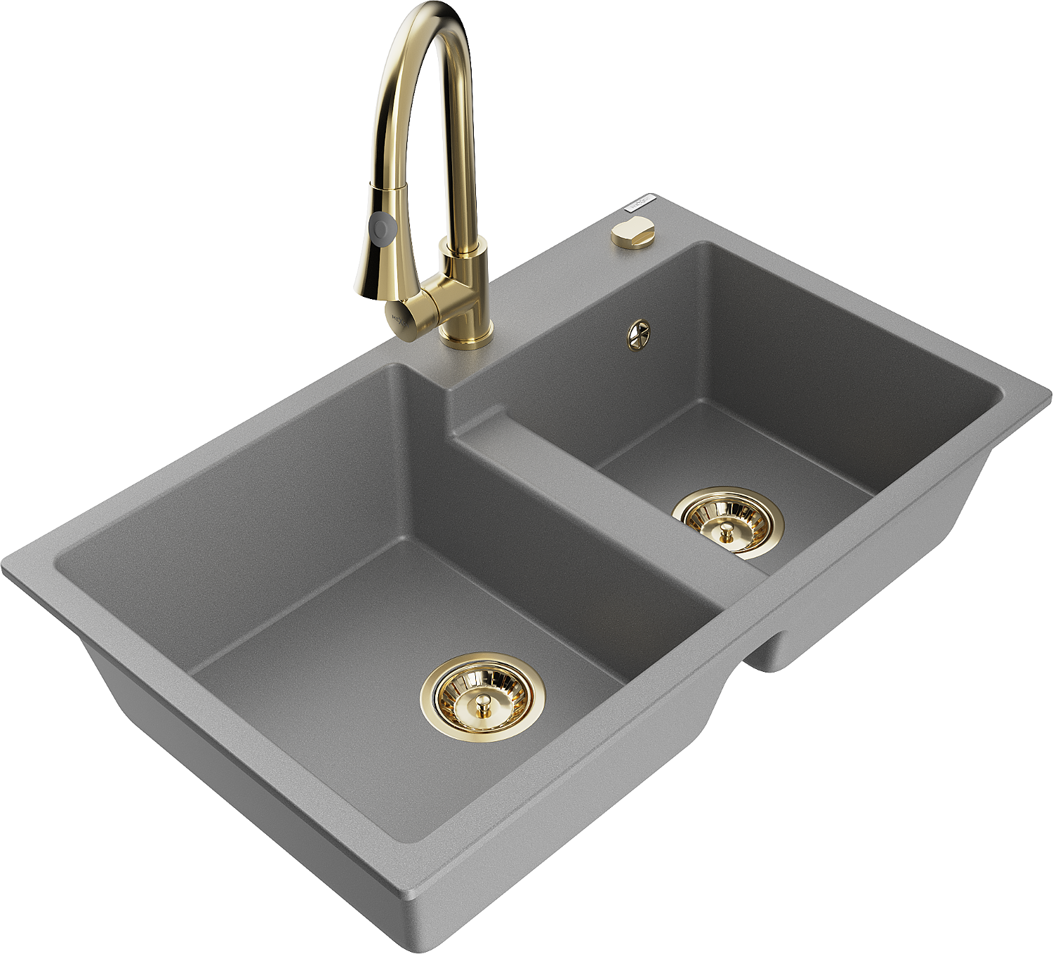 Mexen Tomas granitový drez 2-komorový s kuchynskou batériou Elia, sivý - 6516-71-670101-50