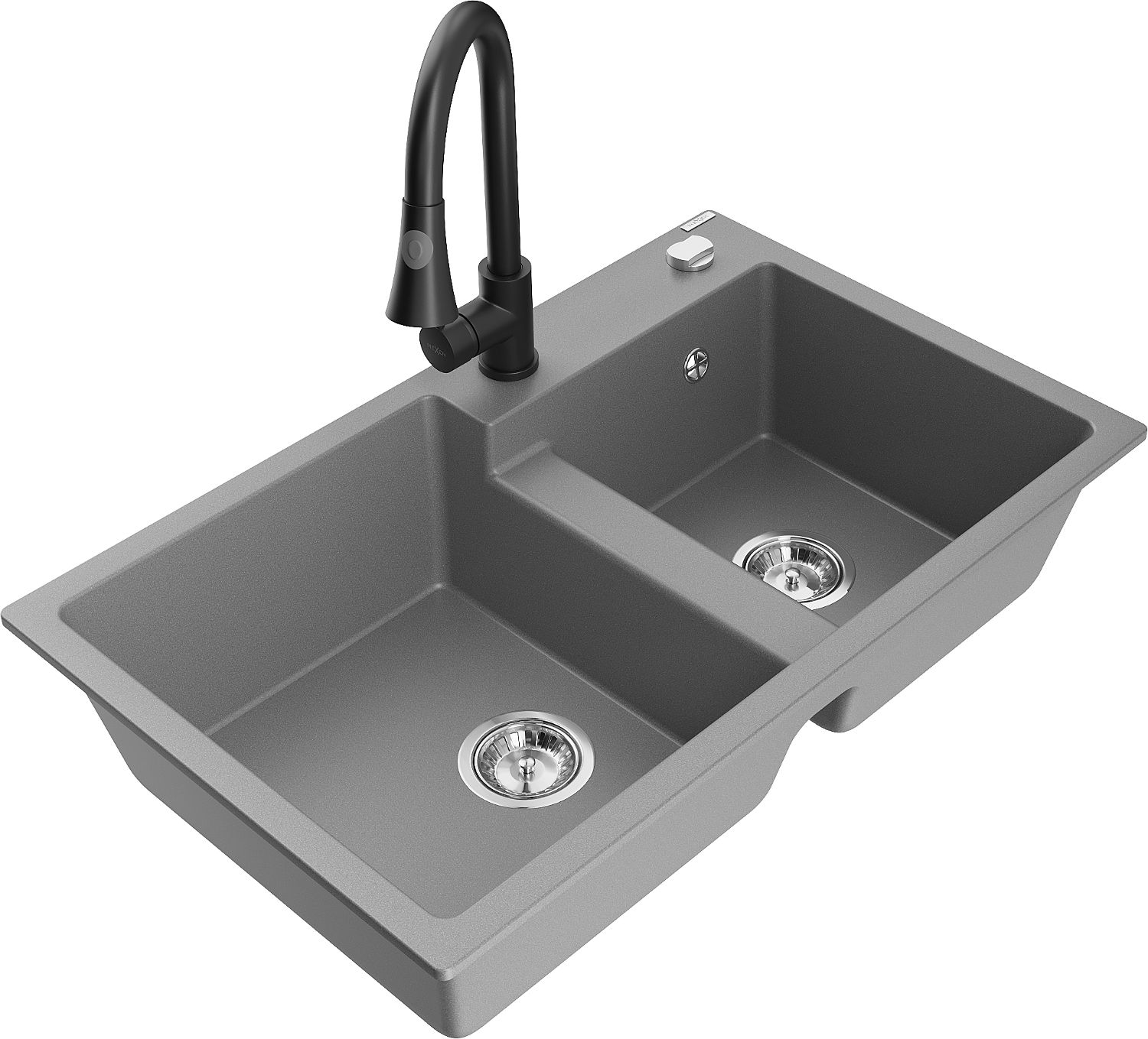 Mexen Tomas granitový drez 2-komorový s kuchynskou batériou Elia, sivý - 6516-71-670101-70