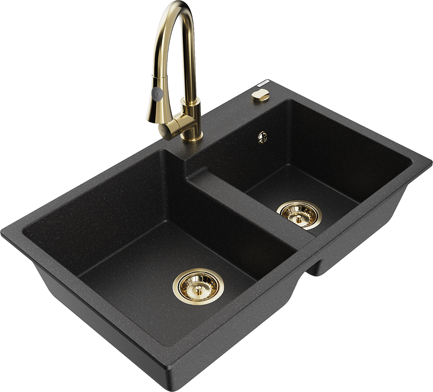Mexen Tomas žulový drez s 2 komorami s kuchynskou batériou Elia, čierny/strieborný metalik - 6516-73-670101-50