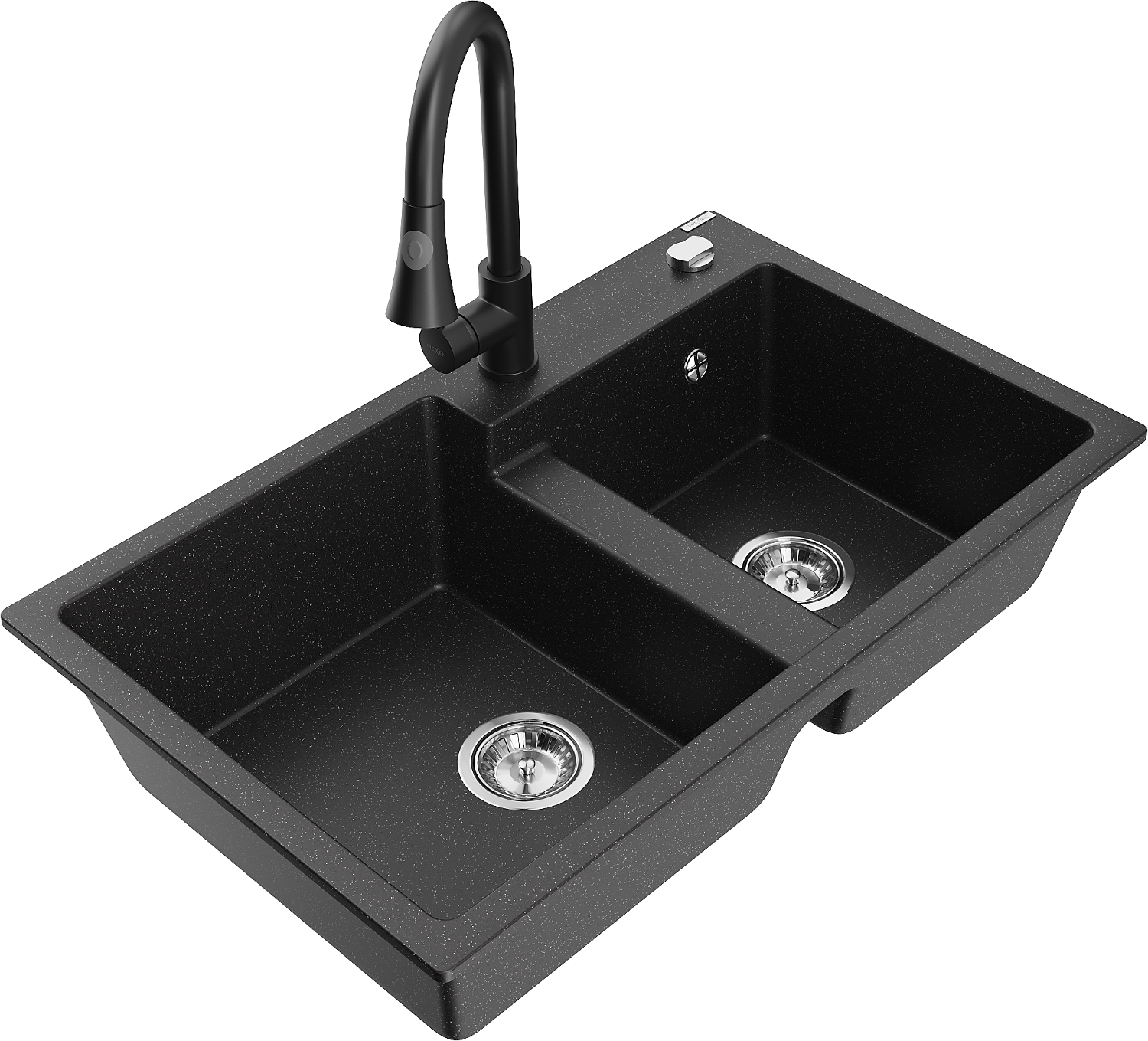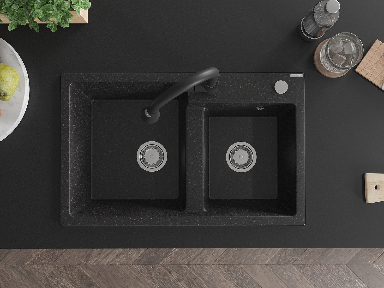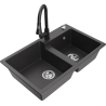Mexen Tomas granitový drez 2-komorový s kuchynskou batériou Elia, čierny/strieborný metalik - 6516-73-670101-70