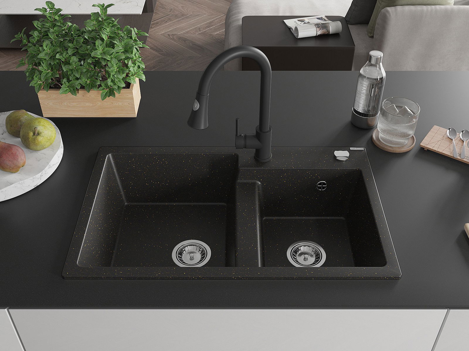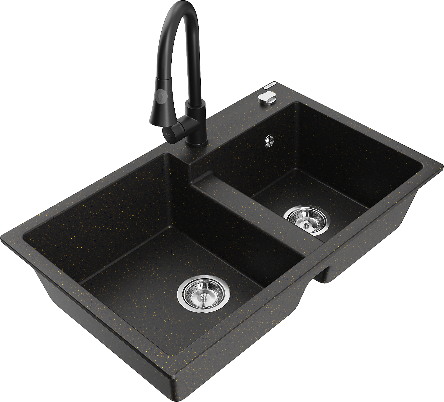 Mexen Tomas žulový drez 2-komorový s kuchynskou batériou Elia, čierny/zlatý metalik - 6516-75-670101-70