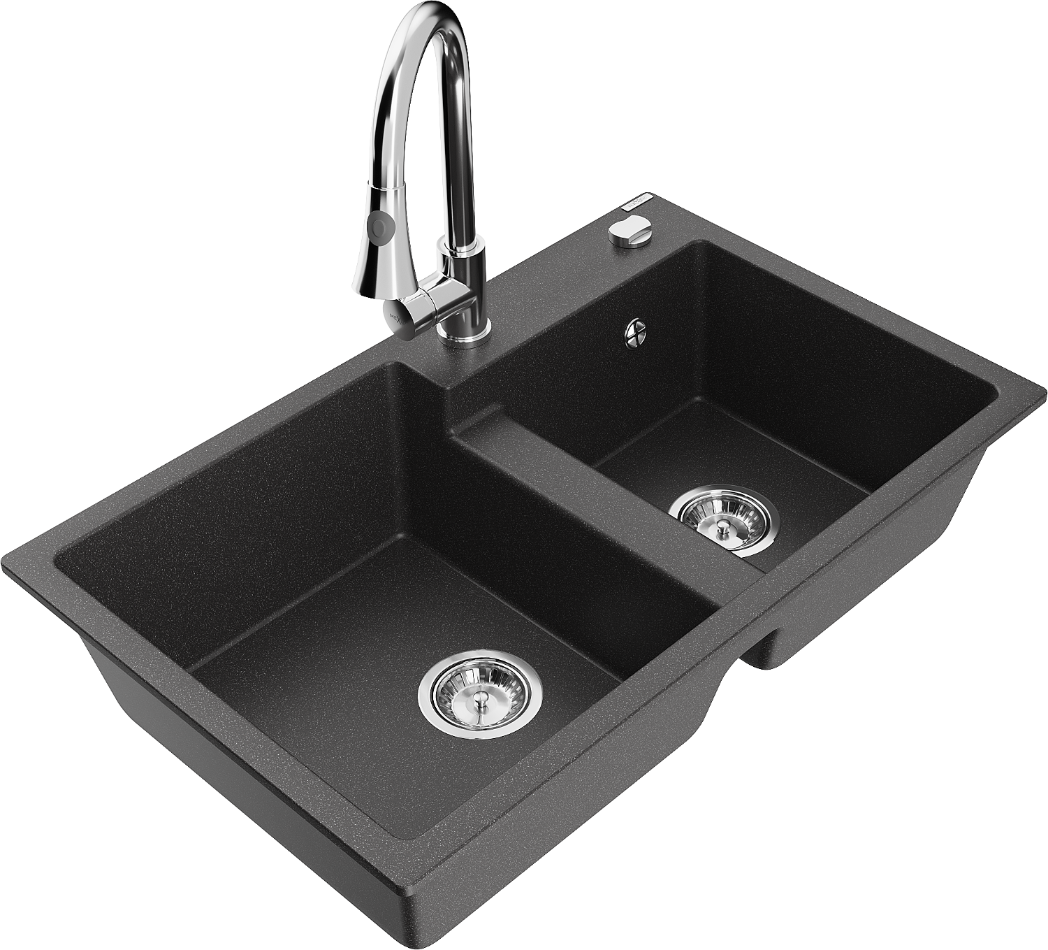 Mexen Tomas granitový kuchynský drez s 2 komorami s kuchynskou batériou Elia, čierny škvrnitý - 6516-76-670101-00