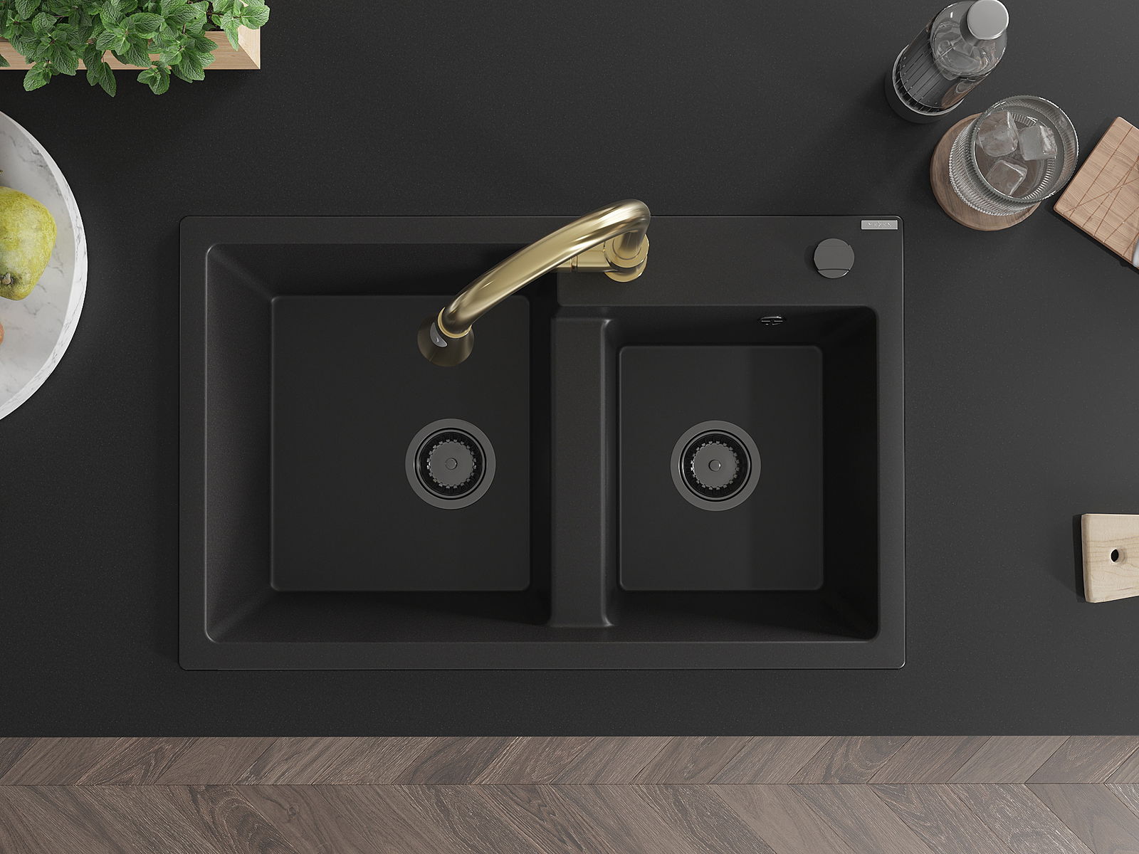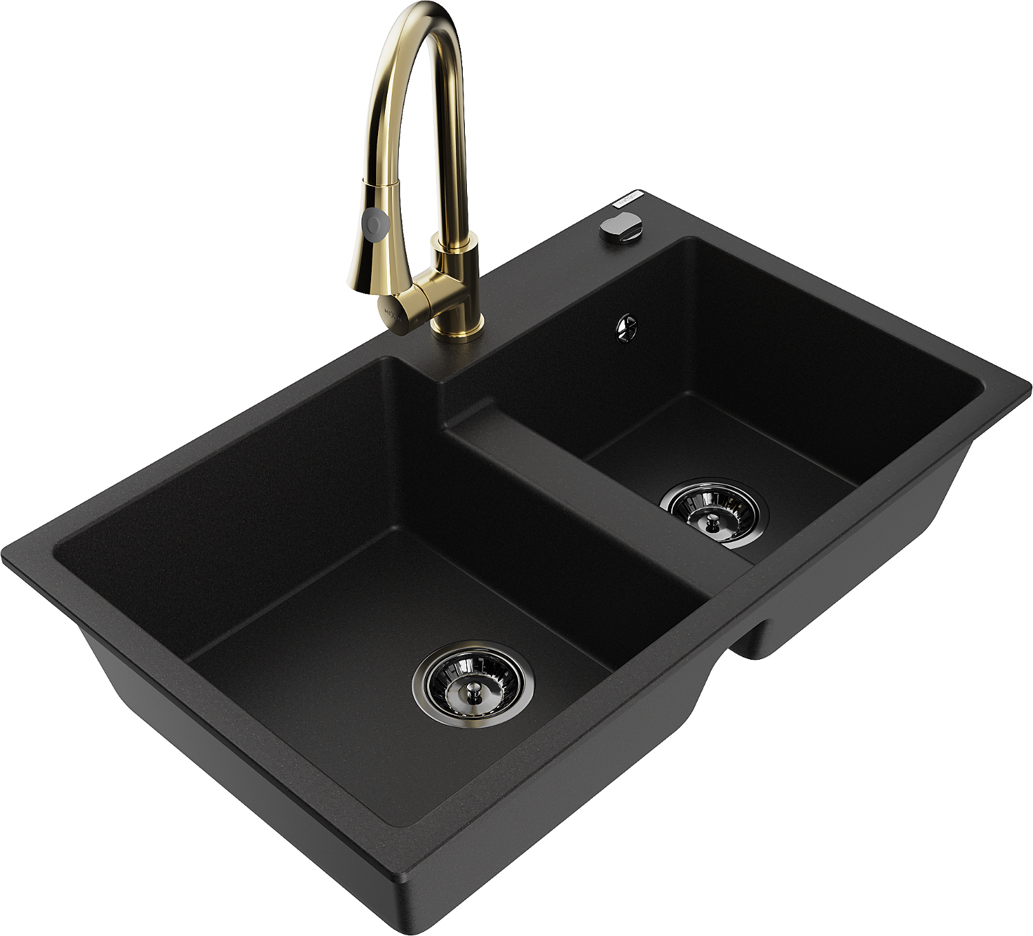 Mexen Tomas granitový drez, 2-komorový s kuchynskou batériou Elia, čierny - 6516-77-670101-50-B