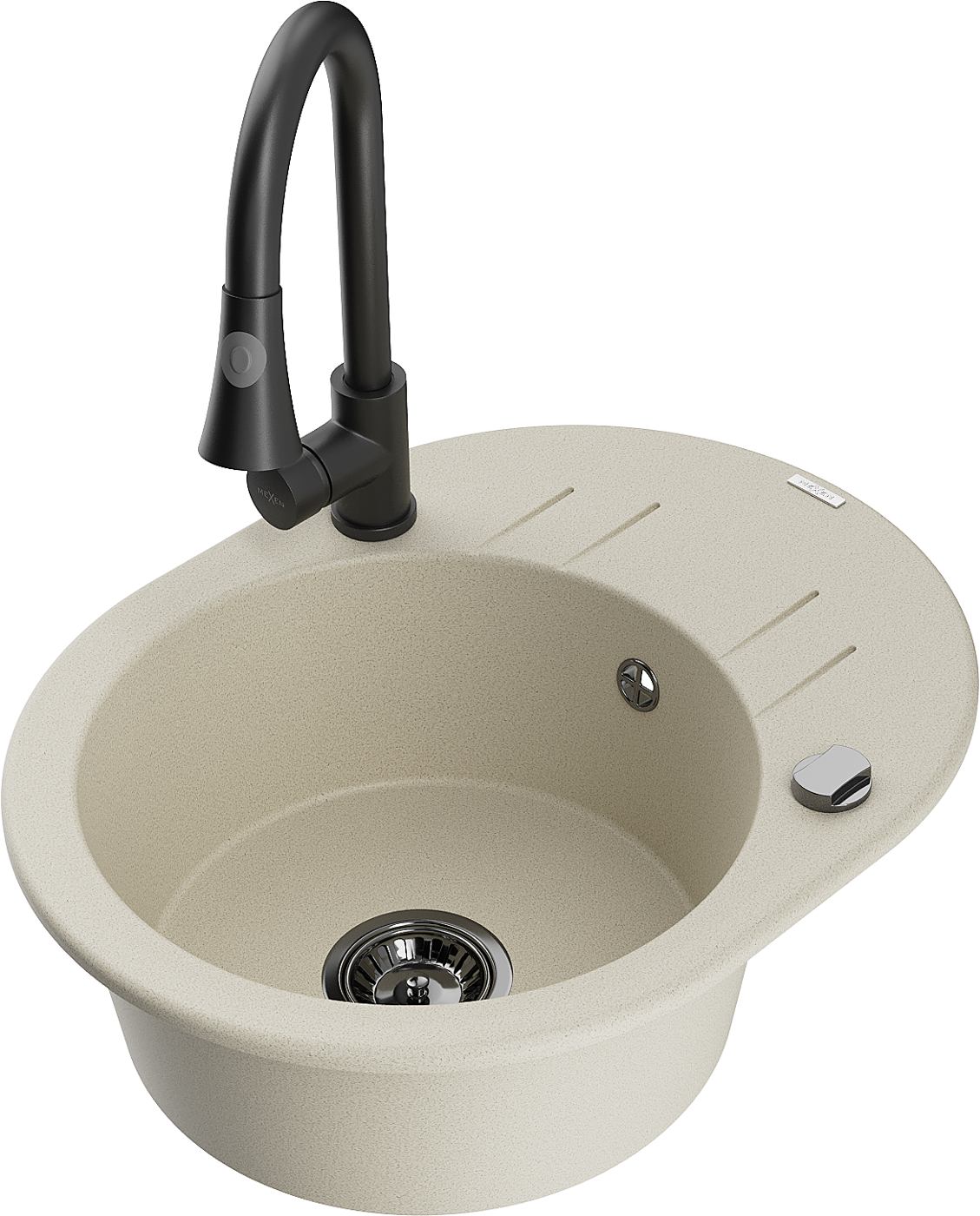 Mexen Kevin granitový drez 1-komorový s odkvapkávačom a kuchynskou batériou Elia, béžový - 6517-69-670101-70
