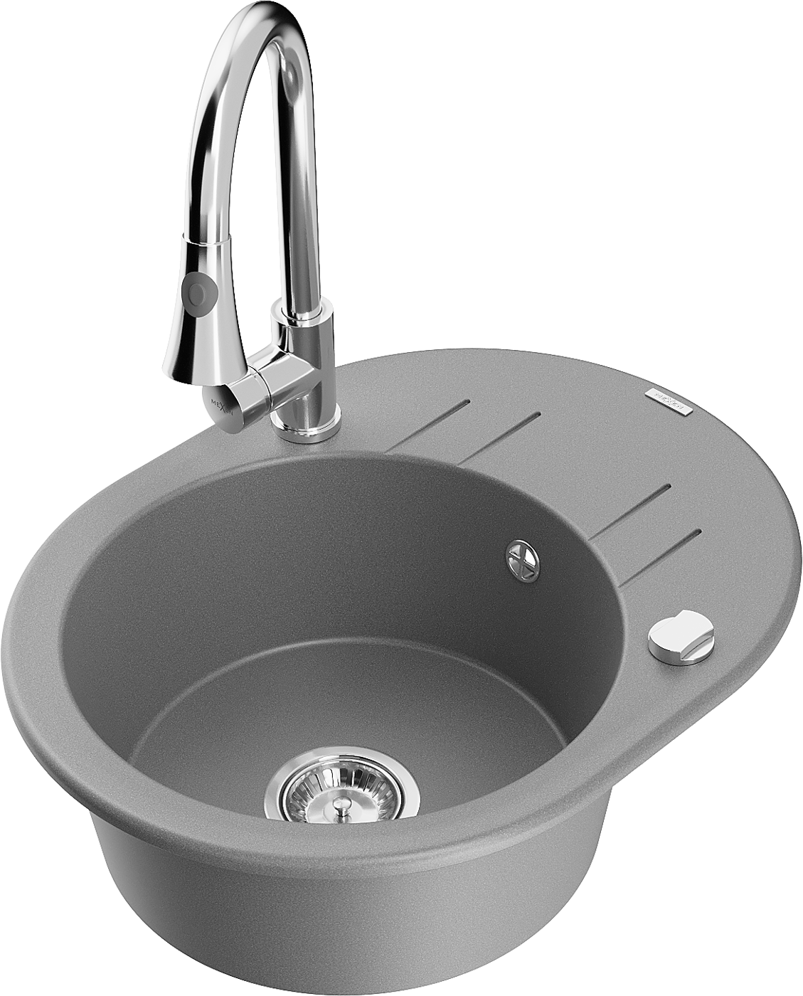 Mexen Kevin žulový kuchynský drez 1-komorový s odkvapkávačom a kuchynskou batériou Elia, sivý - 6517-71-670101-00